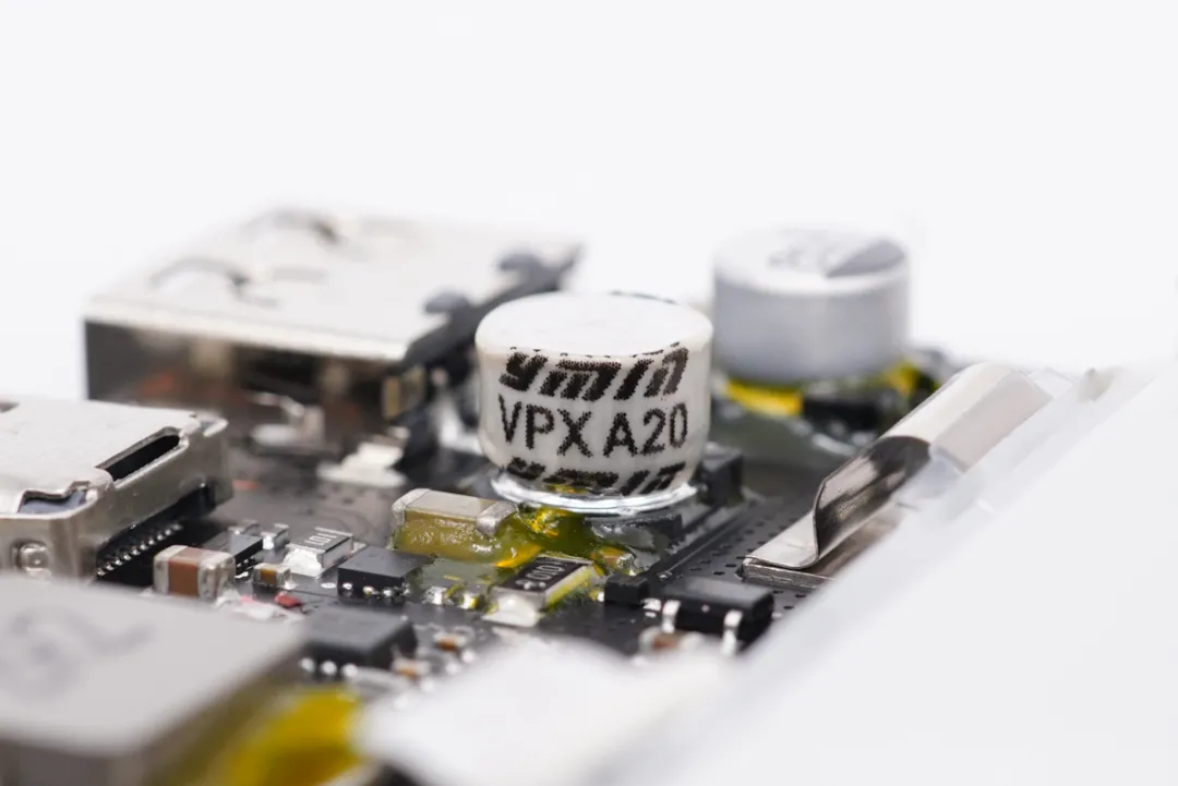 三星25W快充移动电源由于使用了2串电池组,内部采用了升降压电路,USB-C输入端,采用了一颗永铭VPX贴片电容为升降压输入端滤波,同时也用于升降压放电输出的滤波。