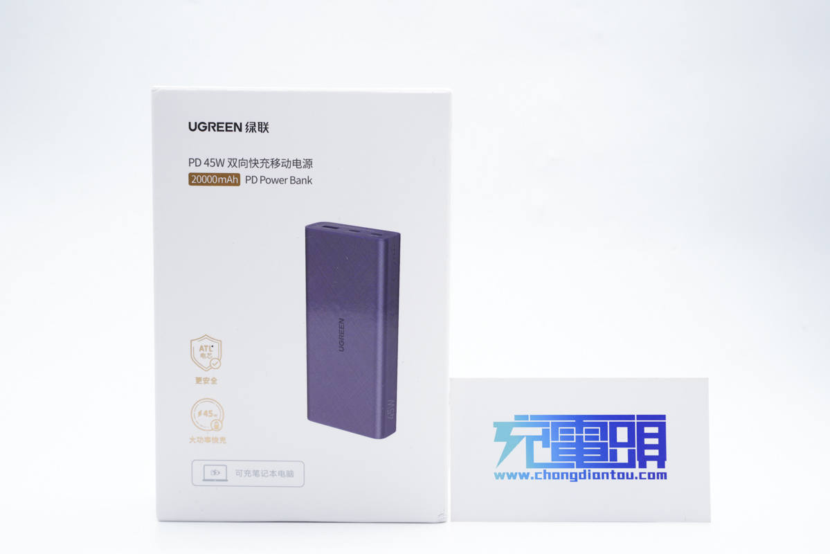 包装盒正面印有UGREEN绿联品牌、产品名称、外观图,此外还有ATL电芯、45W快充、可充笔记本电脑三大特性标识。