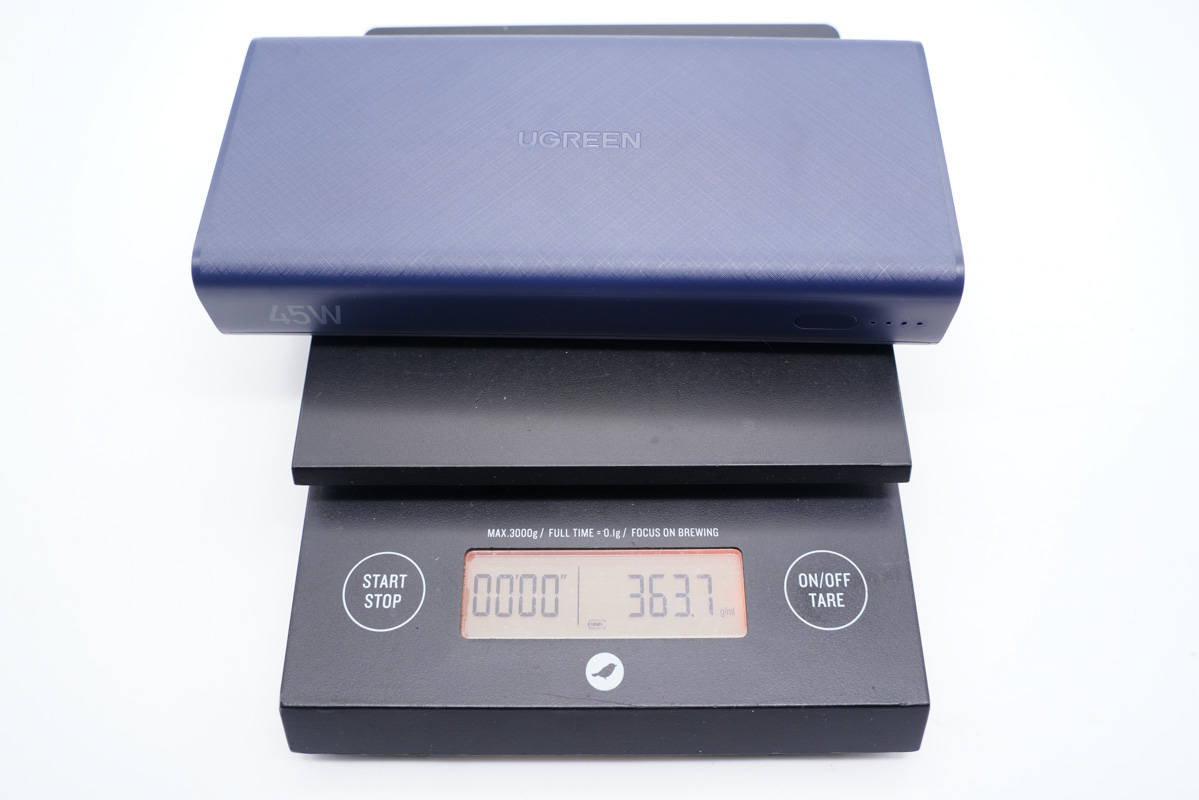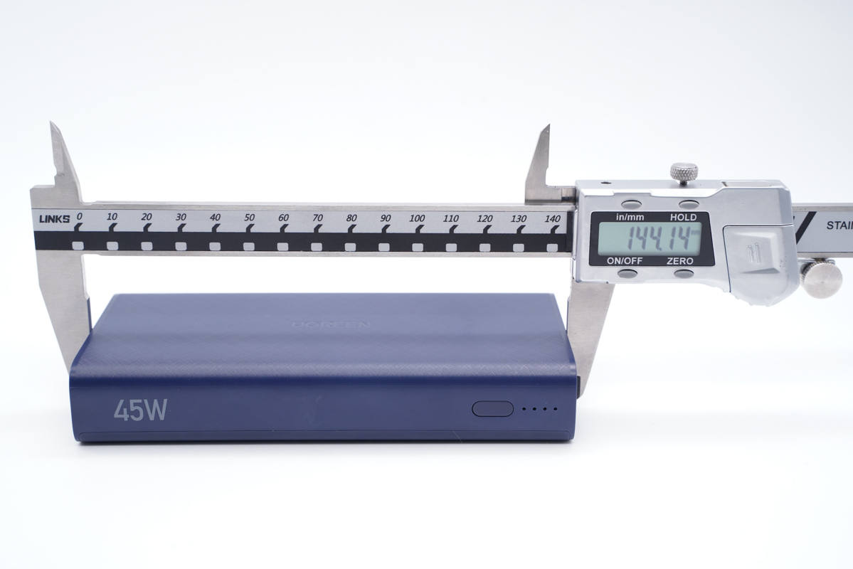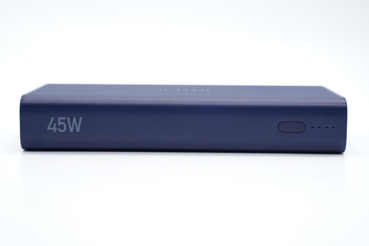 机身一侧配有电源键以及电量指示灯,并印有45W功率字样,表明产品最大输入/输出功率。