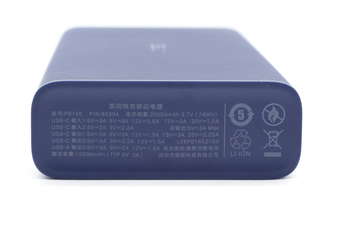 绿联这款移动电源采用PC+ABS防火材质外壳,机身正背面晒纹处理,整体很有质感,手感也不错。电池容量达20000mAh,续航强劲;配备2C1A三个接口,支持45W、30W双向快充,支持苹果iPhone 12 20W快充,最多可以给三台设备同时充电,满足长途旅行中笔电、手机、耳机等设备充电需求。