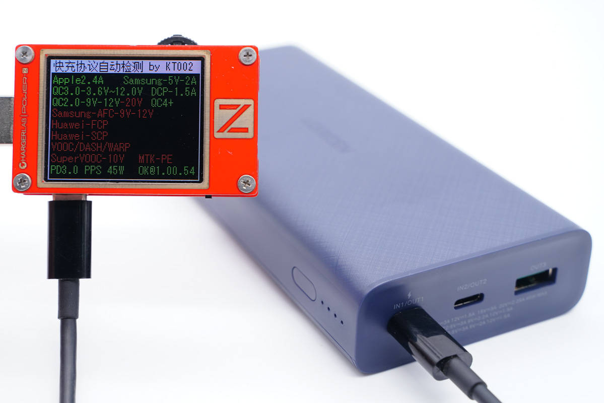 使用ChargerLAB Power-Z KT002测得USB-A口支持Apple2.4A、Samsung 5V2A和DCP协议,以及QC2.0/3.0、AFC、FCP快充协议。