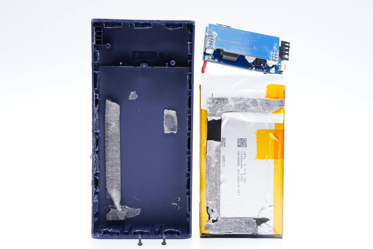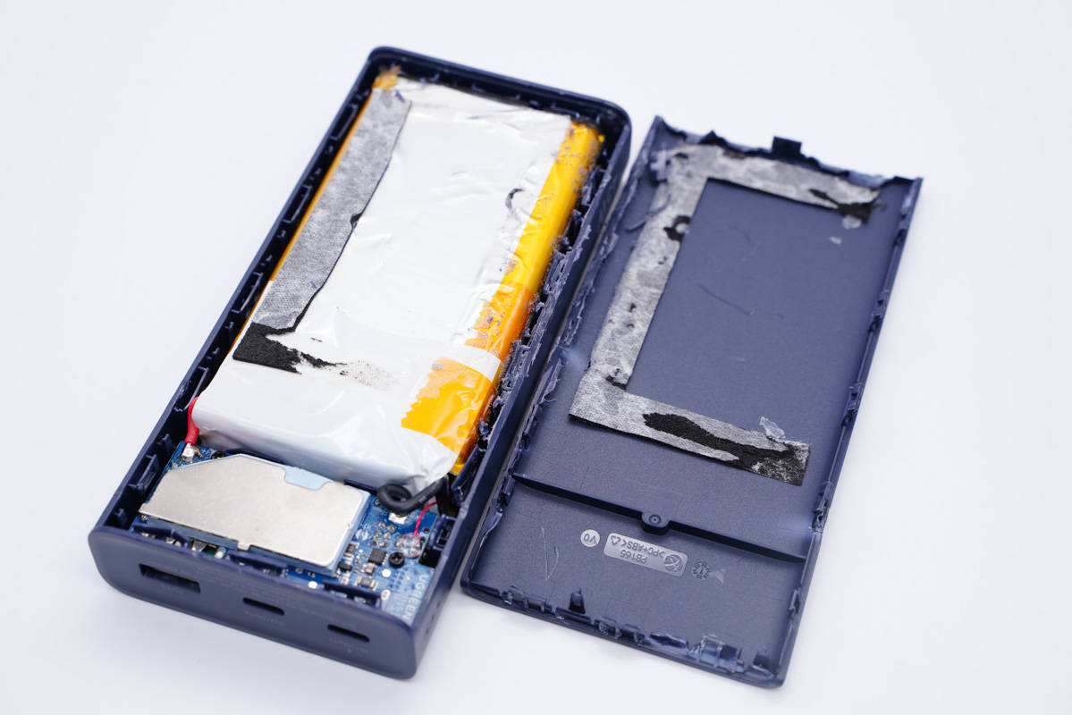 将机身壳拆开,电芯和外壳间有缓冲泡棉进行保护。
