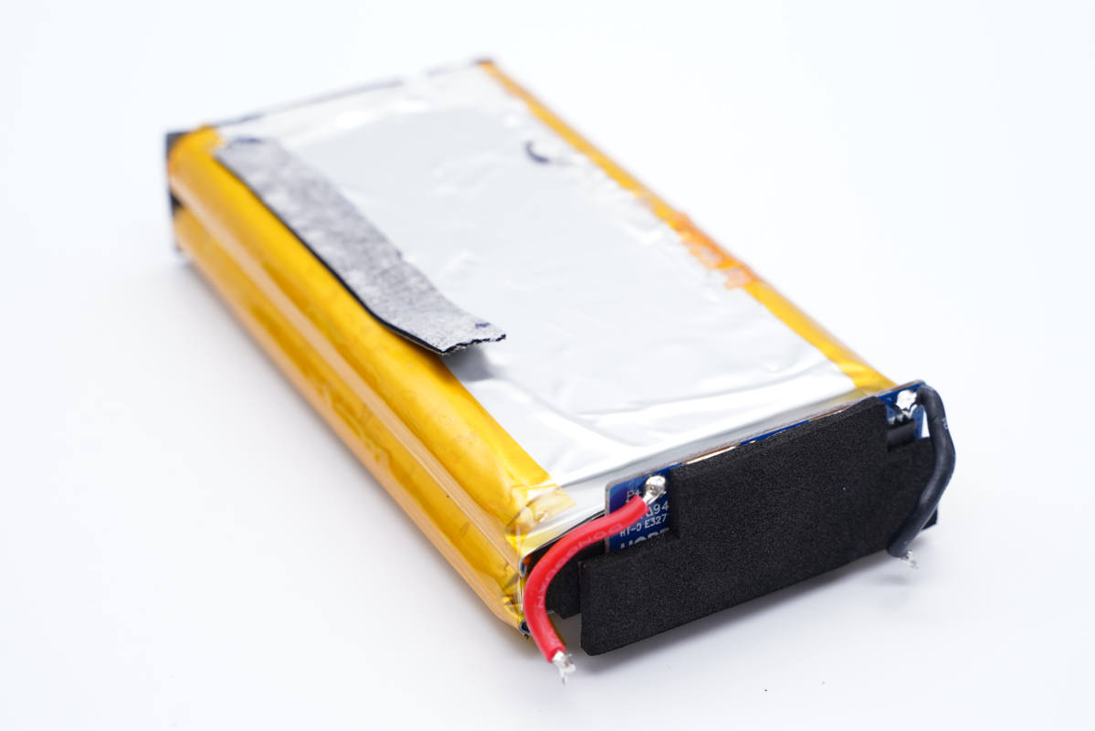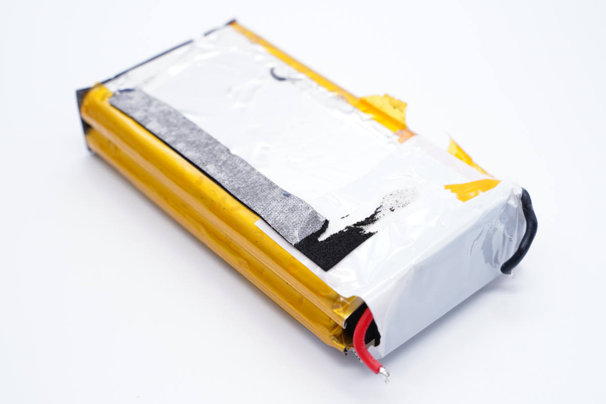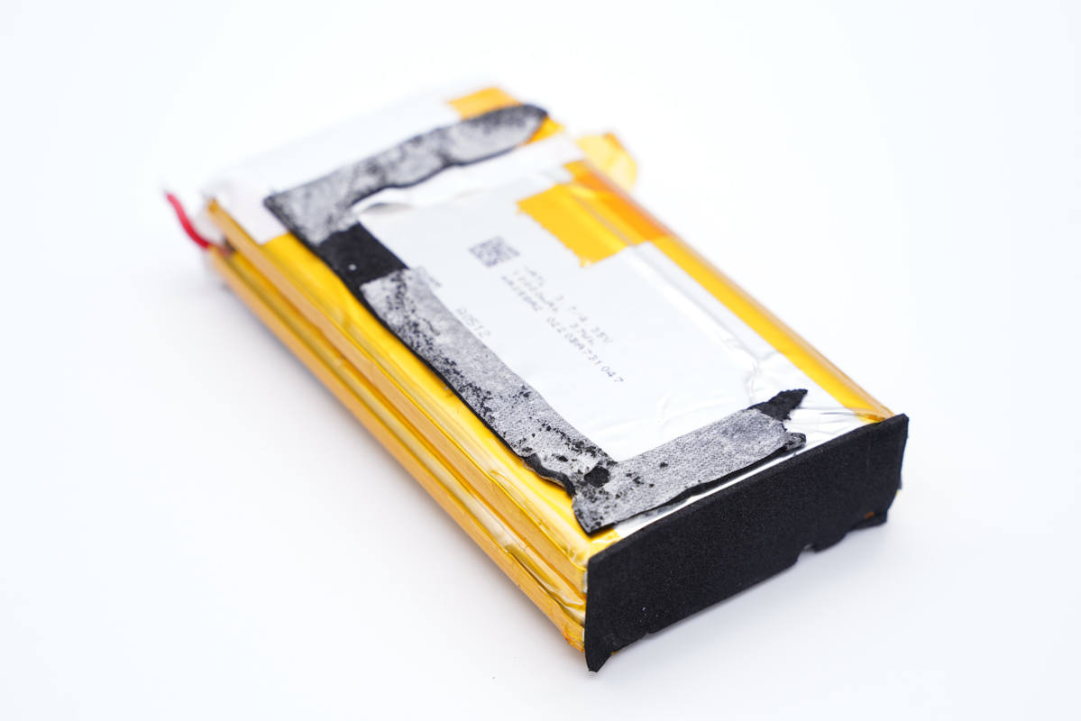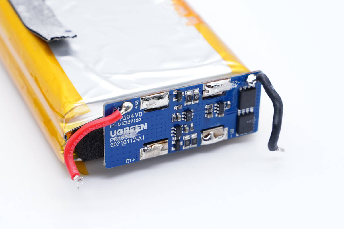 撕掉胶带可以看到头部设有一块保护电路板,覆盖泡棉,电芯极耳处也填充泡棉保护。
