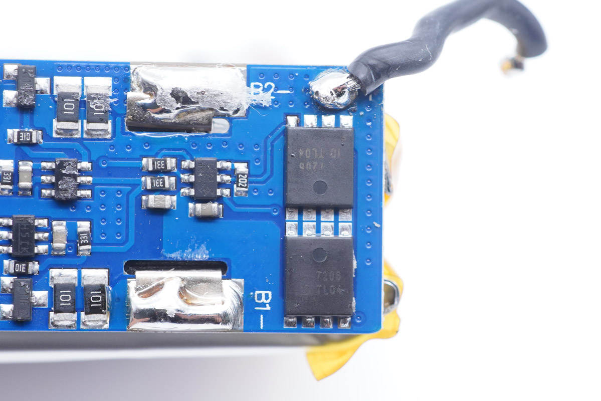 主板背面贴有导热垫和散热片,右侧连接一颗热敏电阻用于监控电芯温度,焊点涂胶保护。