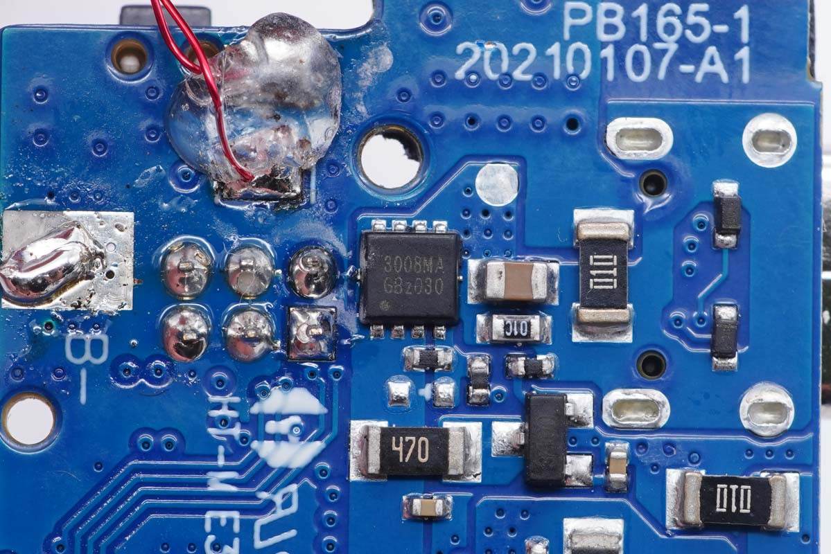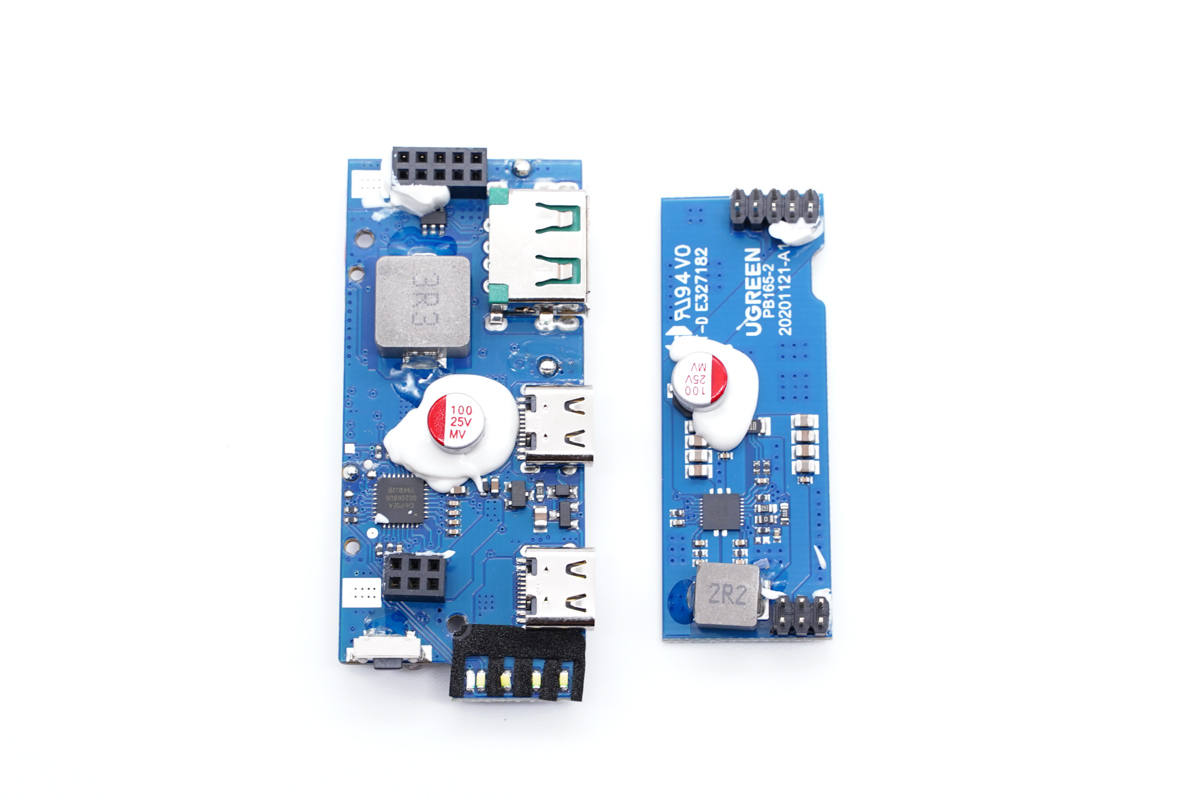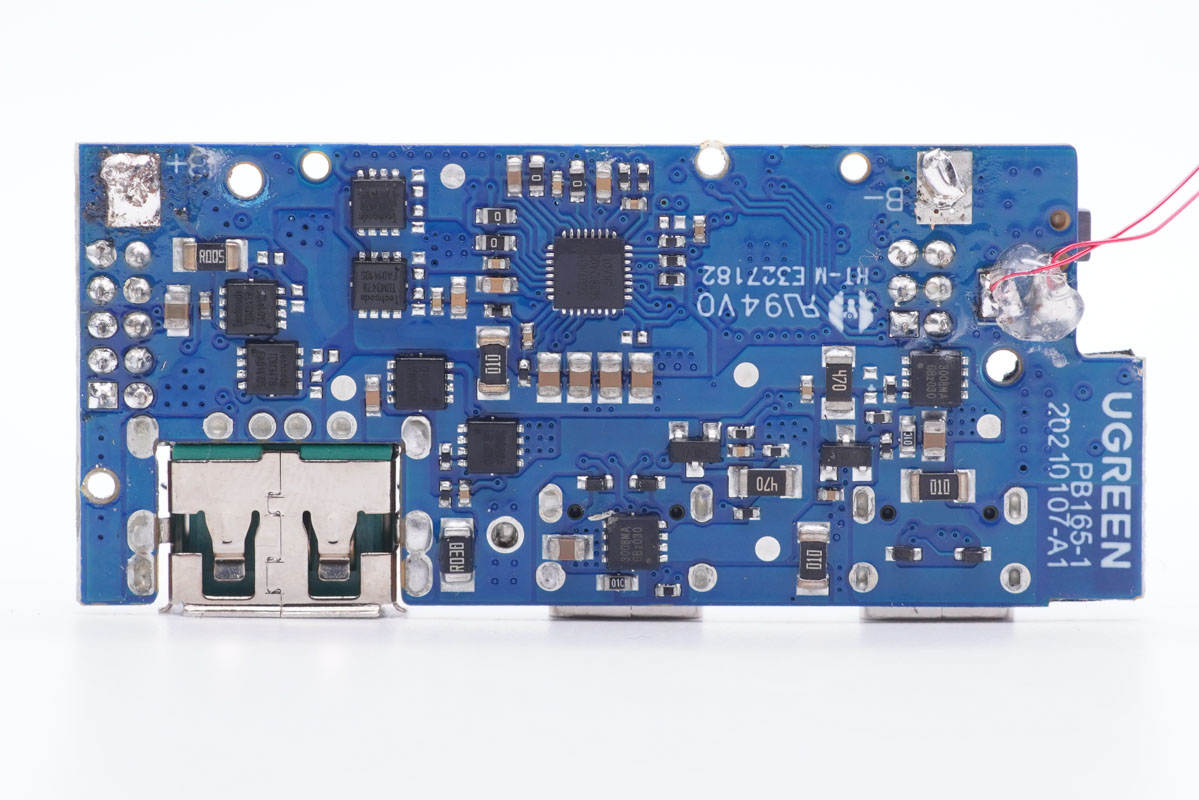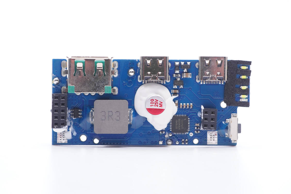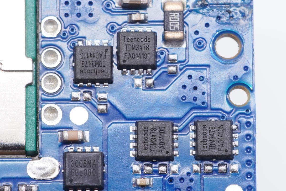 PCB板双层结构设计,两个C口共用一套输入输出充电方案,南芯SC8812A搭配泰德TDM3478进行升降压,采用芯海科技CS32G020控制两个C口输入输出电压,此外升降压电路贴有导热垫和散热片帮助散热,电容、电感打胶固定。USB-A口采用南芯SC8905升降压方案,天德钰FP6601Q协议芯片控制输出电压。产品整体用料做工可靠。