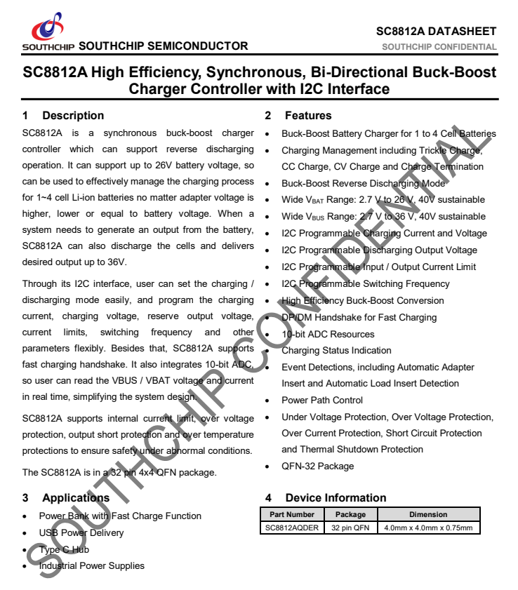 C口升降压转换器采用南芯SC8812A,这是一款高效率同步双向升降压芯片,支持升压或降压为1到4节电池充电,可完成充电、放电控制,支持各种电压转换和充电状态指示;内置10bit ADC,采用I2C数控接口,配置输出电压和限流值,简化的外部器件,有助于减少占板面积。