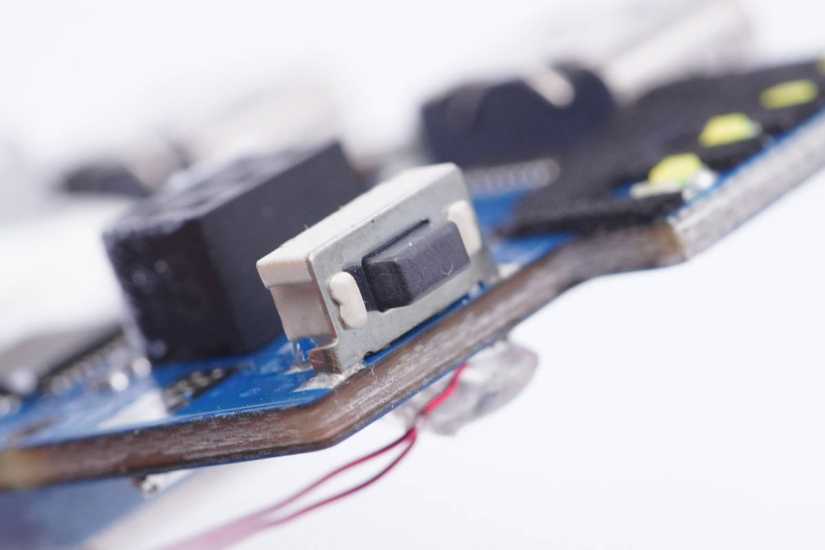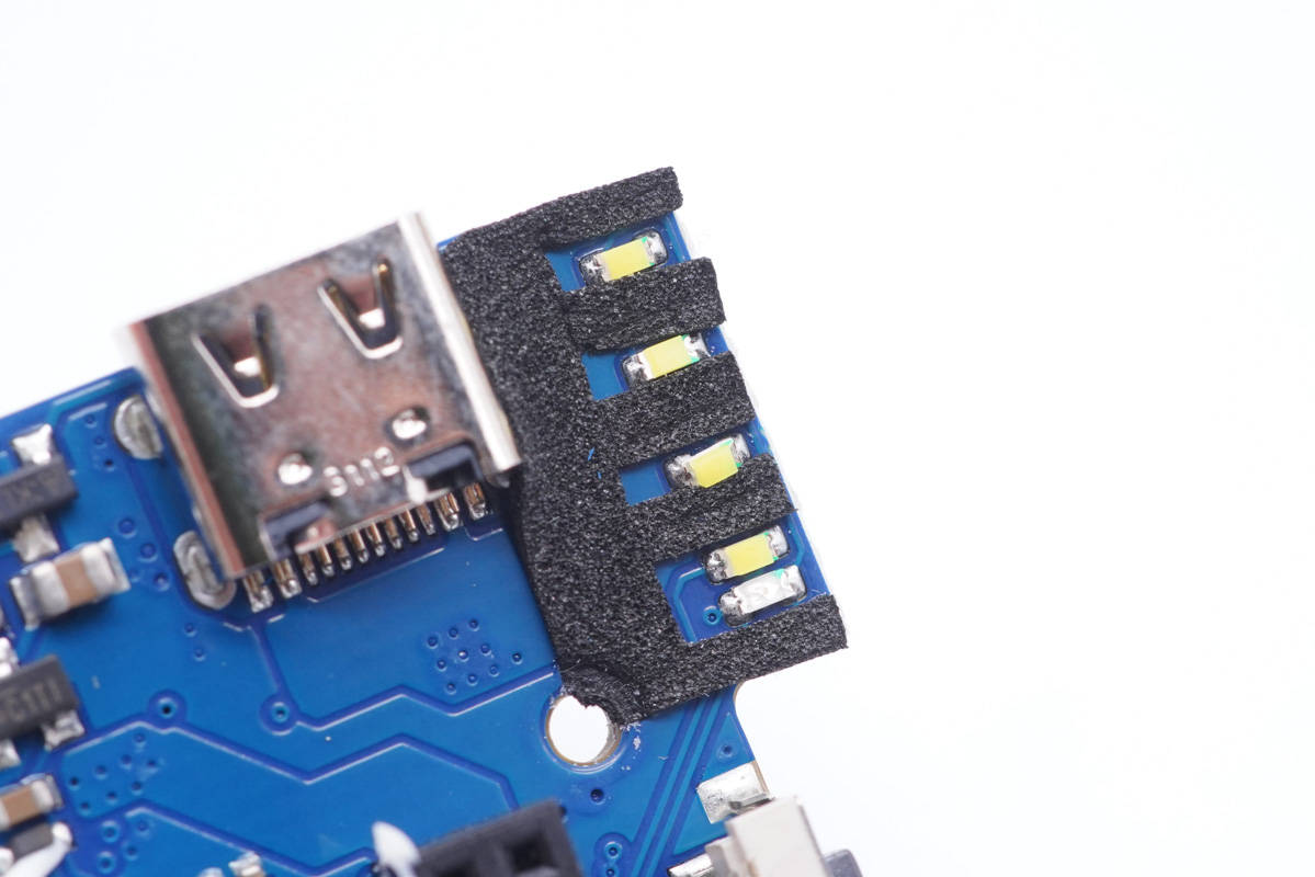 LED指示灯特写,贴有泡棉防串光,其中一颗快充指示灯和电量指示灯共享一个位置。