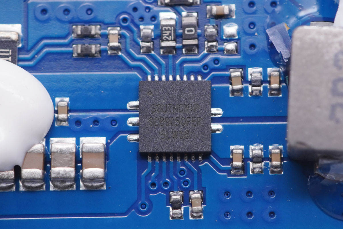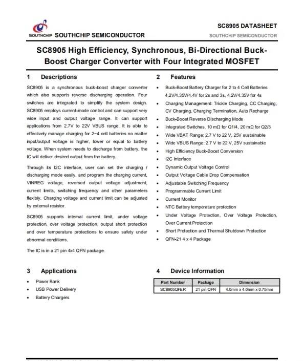 USB-A口升降压转换器采用南芯SC8905,这是一颗双向同步升降压转换器,内部集成了4颗低Rdson功率管,转换效率超高以减少热损耗,同时可以最大尺度减小外围器件BOM,优化PCB空间及成本。该芯片使用电流控制模式,支持超宽的2.7V至22V电压输入,可有效管理2节至4节电池的充电;当系统需要从电池获取能量时,可实现电池反向放电功能,用于USB-A口快充输出。