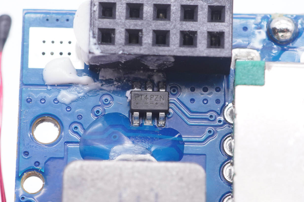 主板正面有两颗协议芯片、电感、电容、LED灯等,电感和电容均打胶加固。