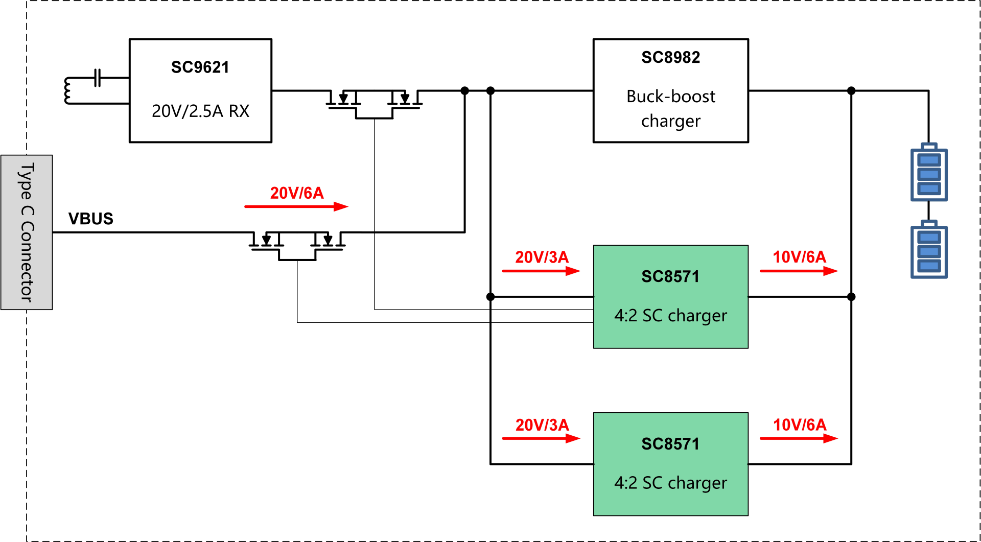 为兼顾大功率无线充电的需求,SC8571支持有线无线双路径管理,集成两路驱动,可任意选择有线或无线快充路径。