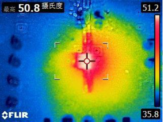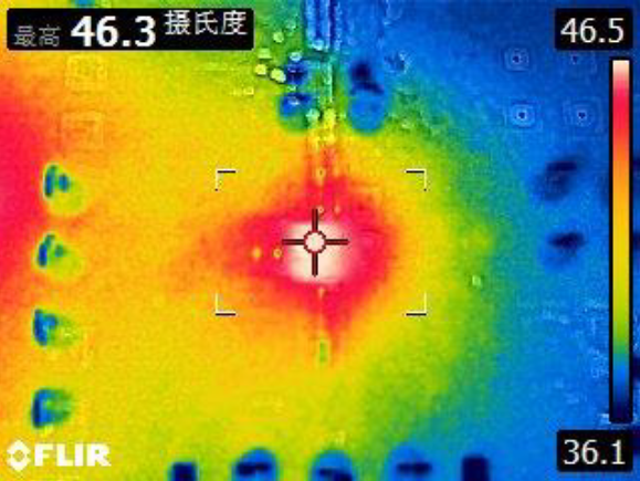 - 图5(b)为2:2直充模式下7A充电电流时的温升示意图,芯片表面的温升大约为46.3-25=21.3℃。