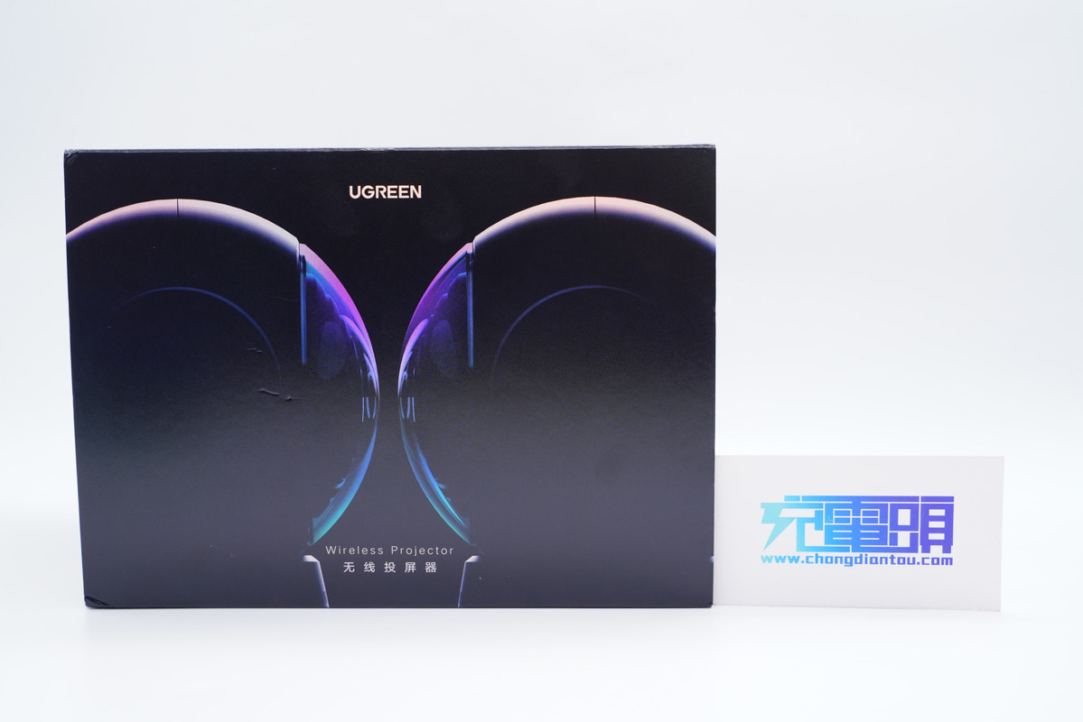 这就是UGREEN绿联推出的毫米波无线投屏器,包装盒的正面看上去就有一种两个星球对立相望的感觉,顶部是UGREEN的品牌Logo。