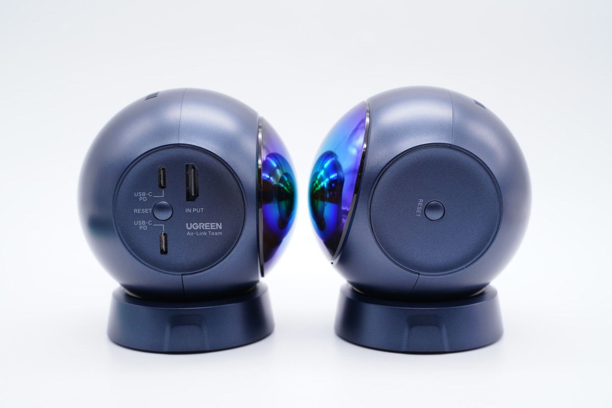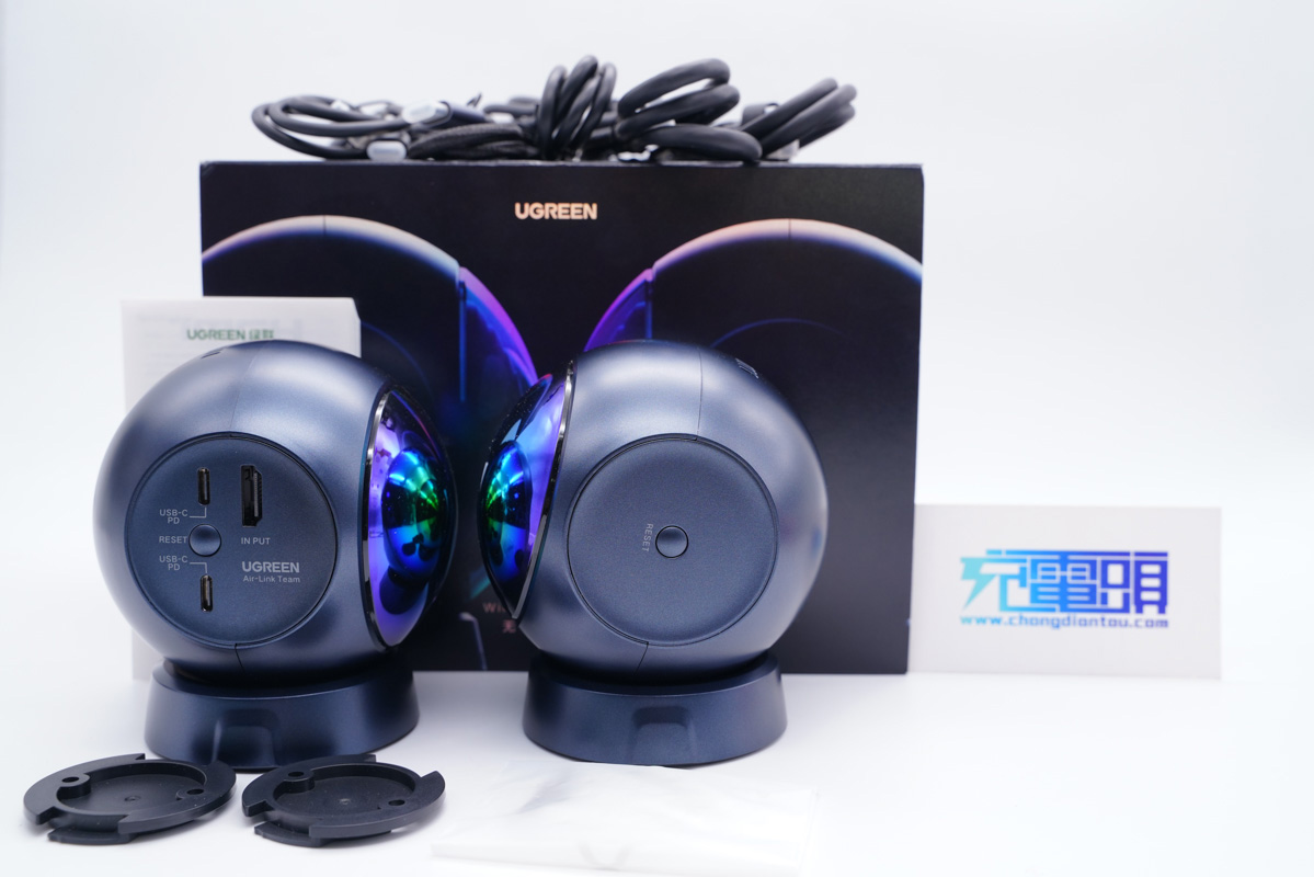 下面来正式看产品,UGREEN绿联毫米波无线投屏器整体分为发射端和接收端,好似两个对望的星球,因此它还有一个偏科幻风的名字——星云瞭望者,和包装盒正面的风格一致。