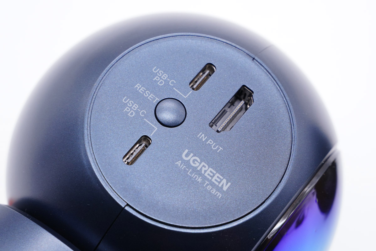 这是发射端的机身侧面,自带重置按键,2个USB-C接口均支持PD快充以及数据传输,HDMI接口用于连接设备输入。