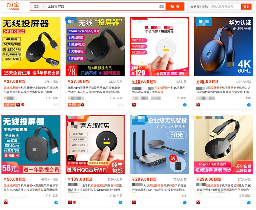 这是在某宝上搜索无线投屏器关键字出来的产品,价格从几十块钱到几百块不等,那UGREEN绿联的这款毫米波无线投屏器的优势在哪里呢?