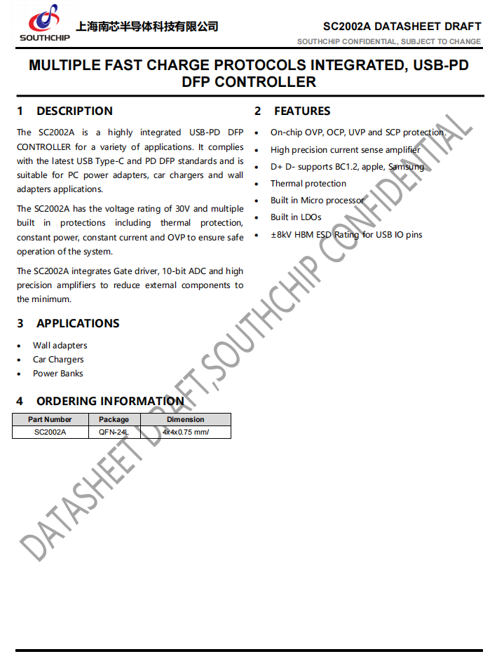 南芯SC2002A是一款高度集成的PD DFP控制器。它符合最新的USB Type-C和PD 3.0标准,并支持最流行的高压快速充电协议(包括华为SCP和VOOC闪充),最多支持2组DPDM接口,可以单芯片支持1C1A应用,广泛应用于墙充,车充和支持USB快充的插线板。