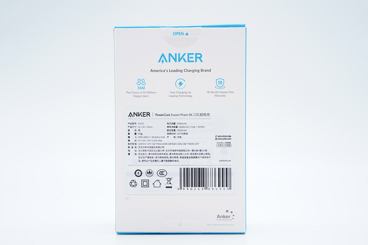 产品包装盒是熟悉的蓝白配色,正面印有ANKER品牌logo。