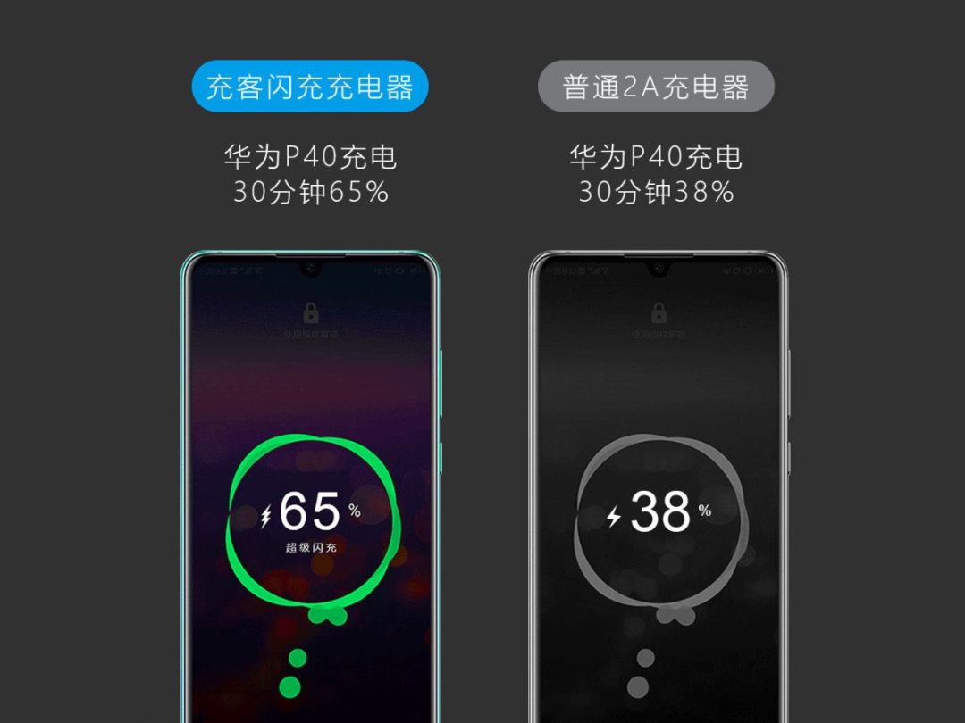 充客22.5W闪充充电器支持华为超级快充,搭配充客HX1006T 5A闪充线,可输出5A大电流超级快充,与华为手机完美搭配。使用充客22.5W闪充充电器对华为P40手机充电,30分钟可充入65%电量,而传统的5V2A充电器30分钟仅充入38%电量,充客充电速度接近翻倍,迅速为手机恢复大量电力。
