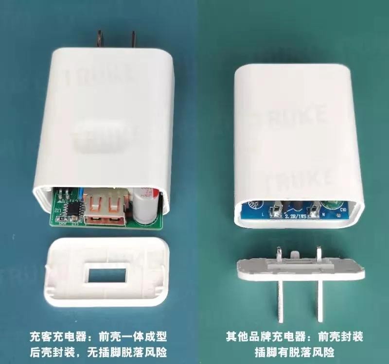 华为原厂充电器也是用这种插脚和前壳一体成型结构、后盖封装工艺,充客采用这种工艺大幅度提升产品安全性。