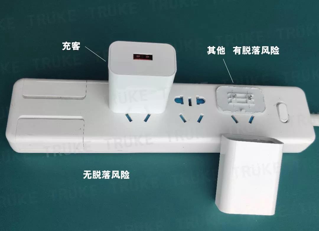 市面上大部分充电器插脚和壳体都是分离的,在前壳插脚处封装(如上图右),这样生产工艺相对简单,但是多次插拔或者跌落冲击都可能会导致插脚脱落,一旦插脚脱落留在排插上(下图右),220V电压直接暴露在外面,人体一旦碰触将造成极大的触电风险。
