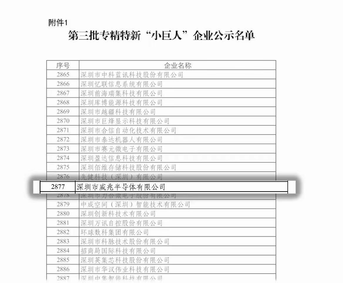 近日,经国家工业和信息化部中小企业局发布《关于第三批专精特新“小巨人”企业名单的公示》,深圳市威兆半导体有限公司获得国家级专精特新“小巨人”认定。