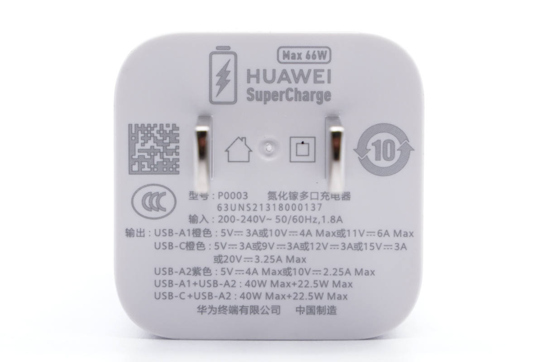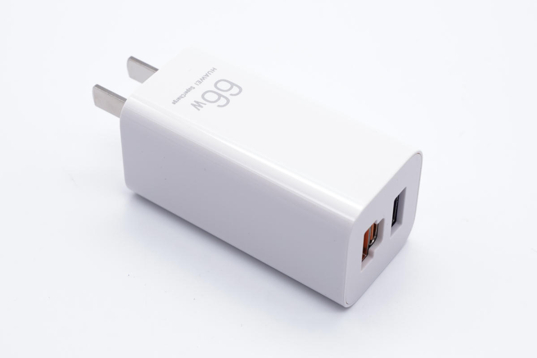 充电器为纯白色长条机身,表面采用烤漆亮面处理,摸上去非常光滑,标配的是一个固定的国标插脚。机身正面印有66W以及HUAWEI SuperCharge字样。