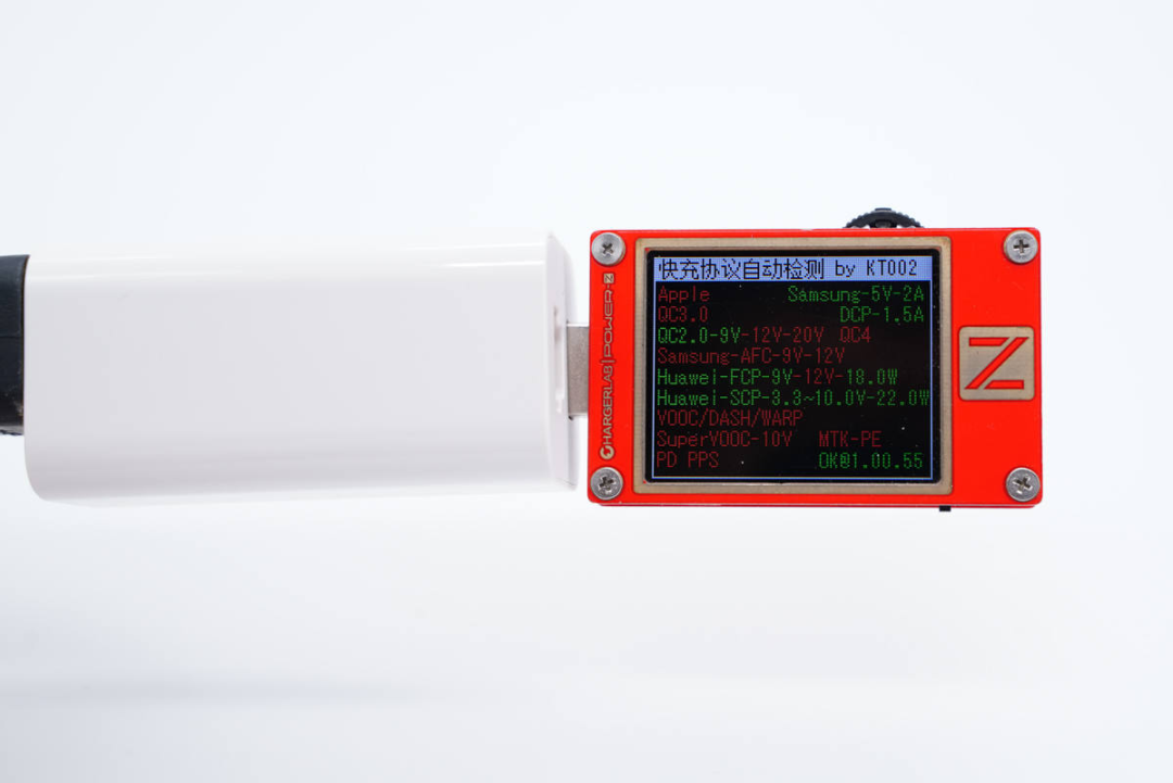 使用ChargerLAB POWER-Z KT002检测USB-A口的输出协议,显示支持Samsung 5V/2A和DCP协议,以及QC2.0、FCP、SCP快充协议。