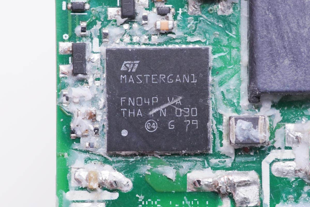 来自意法半导体的MASTERGAN1。这是一颗半桥氮化镓芯片,内置两颗GaN功率器件以及驱动器,采用9*9*1mm的QFN封装,集成度非常高。650V耐压,150mΩ导阻,工作电流10A,用于ACF和LLC架构中,可以一颗顶两颗。