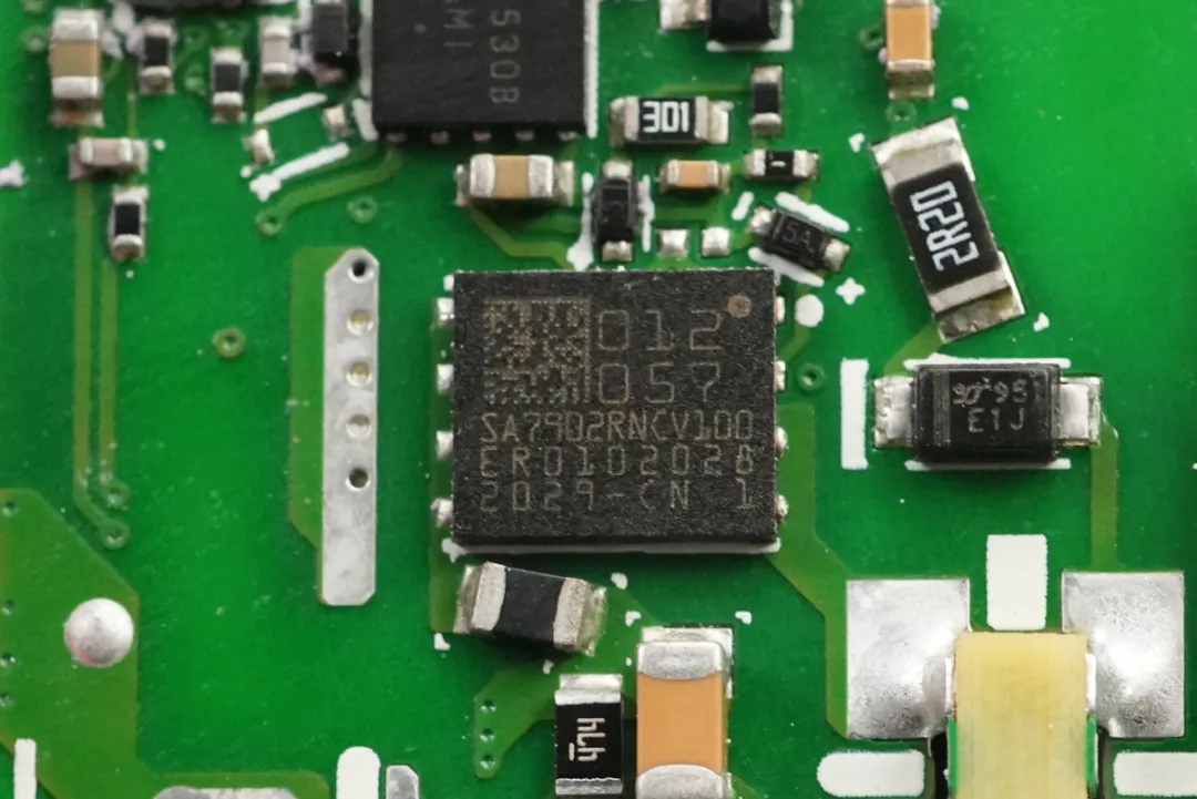 内置两颗丝印SA7902RNCV100,华为定制的GaN开关管。