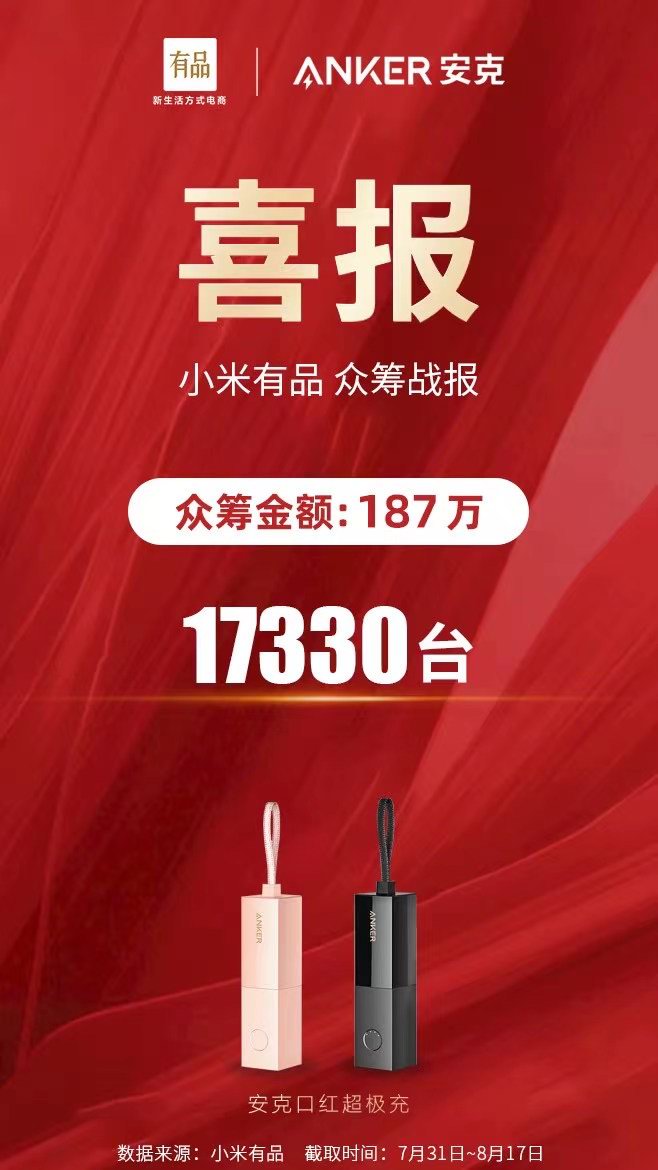 安克口红超极充推出后即登陆小米有品商城开启众筹,共有粉色、黑色两款单机产品与快充线套装等版本可选,众筹价仅99元起。根据小米有品商城统计,7月31日~8月17日期间,众筹金额达到187万元的喜人成绩,合共售出17330台,也证明了安克口红超极充出色的设计与实用性都获得消费者认可。