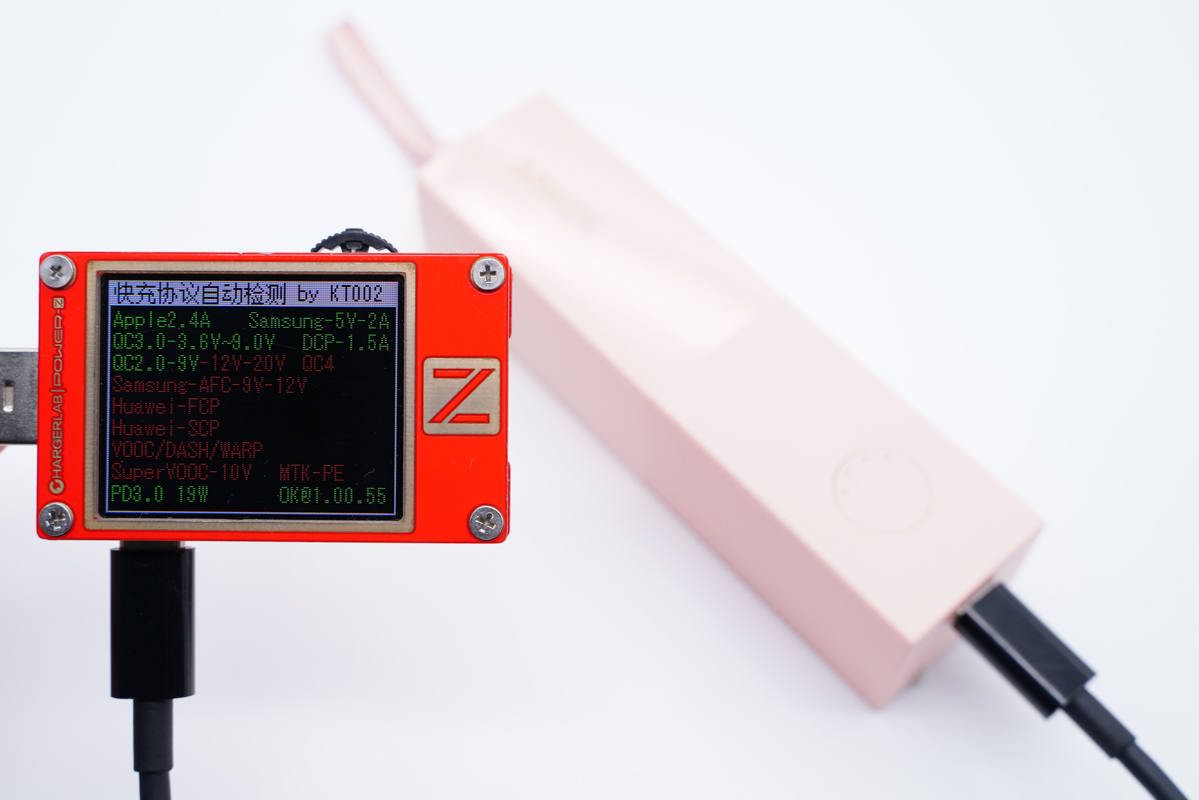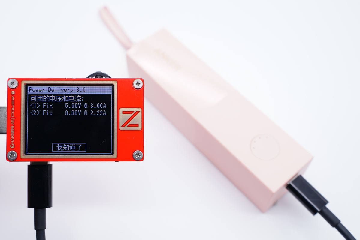 通过POWER-Z KT002 USB测试仪读取输出口PDO报文,不管是充电器模式还是移动电源模式,都具备5V3A、9V2.22A两组电压档位,两种模式均支持20W PD快充输出。