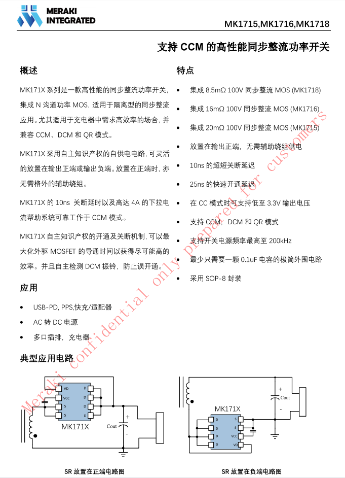 同步整流芯片采用茂睿芯MK1718,集成了次级同步整流控制器和8.5mΩ/100V规格同步整流MOS。茂睿芯MK171X系列是一款高性能的同步整流功率开关,集成N沟道功率MOS,适用于隔离型的同步整流应用。尤其适用于充电器中需求高效率的场合,并兼容CCM、DCM 和QR模式。
