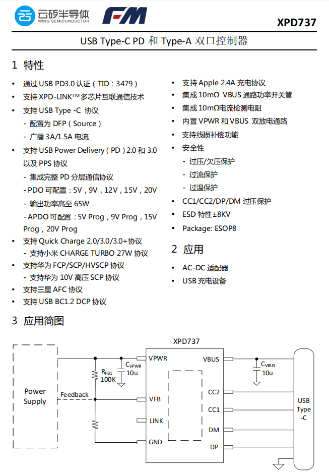 USB PD协议芯片采用云矽半导体XPD737,这款芯片已经通过了USB PD3.0认证,TID:3479。支持QC2.0/3.0/3.0+、AFC、FCP、SCP、HVSCP、PD和PPS等主流快充协议外,还支持小米CHARGE TURBO 27W协议,华为10V高压SCP协议。XPD737内部集成 10mΩ VBUS 通路管,并且集成10mΩ电流检测电阻,支持完善的保护功能,降低外围元件数量,简化电路,降低成本。采用ESOP8封装。
