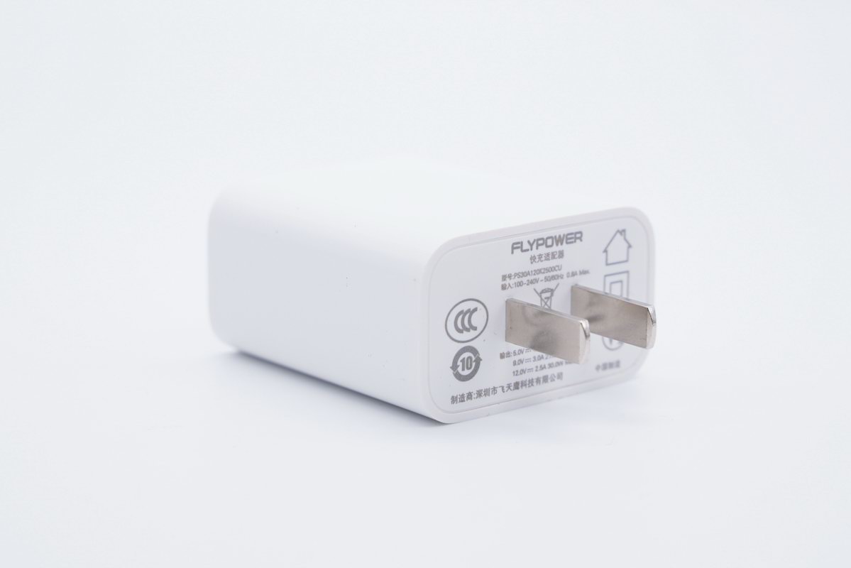插脚方面,飞天鹰30W多协议快充充电器采用了国标两脚固定插脚设计。