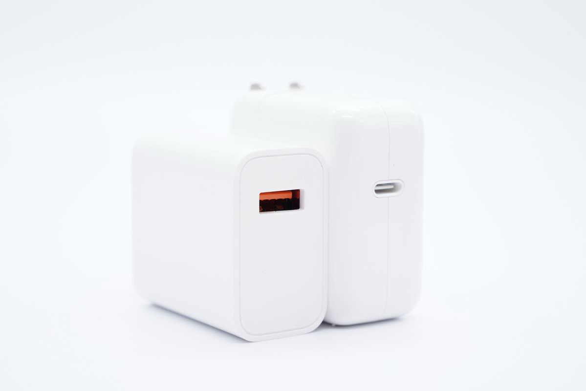 实测飞天鹰30W多协议快充充电器三围尺寸分别为26.62mm X 50.98mm X 45.56mm,重量64.1g,与苹果30W充电器放在一起对比,飞天鹰的比苹果30W体积小巧。