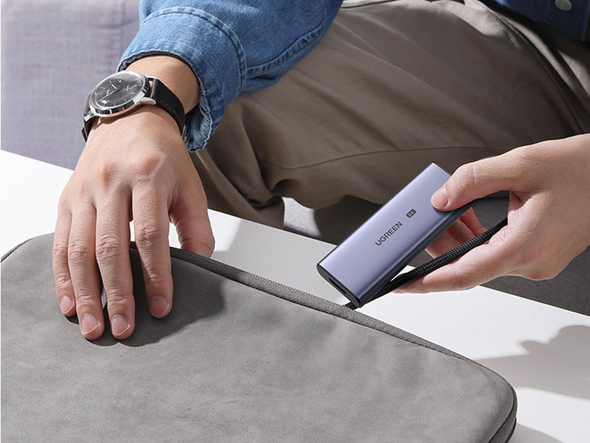 作为贴身携带的笔记本伴侣,体积也是需要考虑的参数,绿联Type-C 8K扩展坞三围尺寸仅为95mm X 37mm X 18mm,可以轻松放入公文包内跟用户一起出行,扁平的外形设计不会造成携带压力。