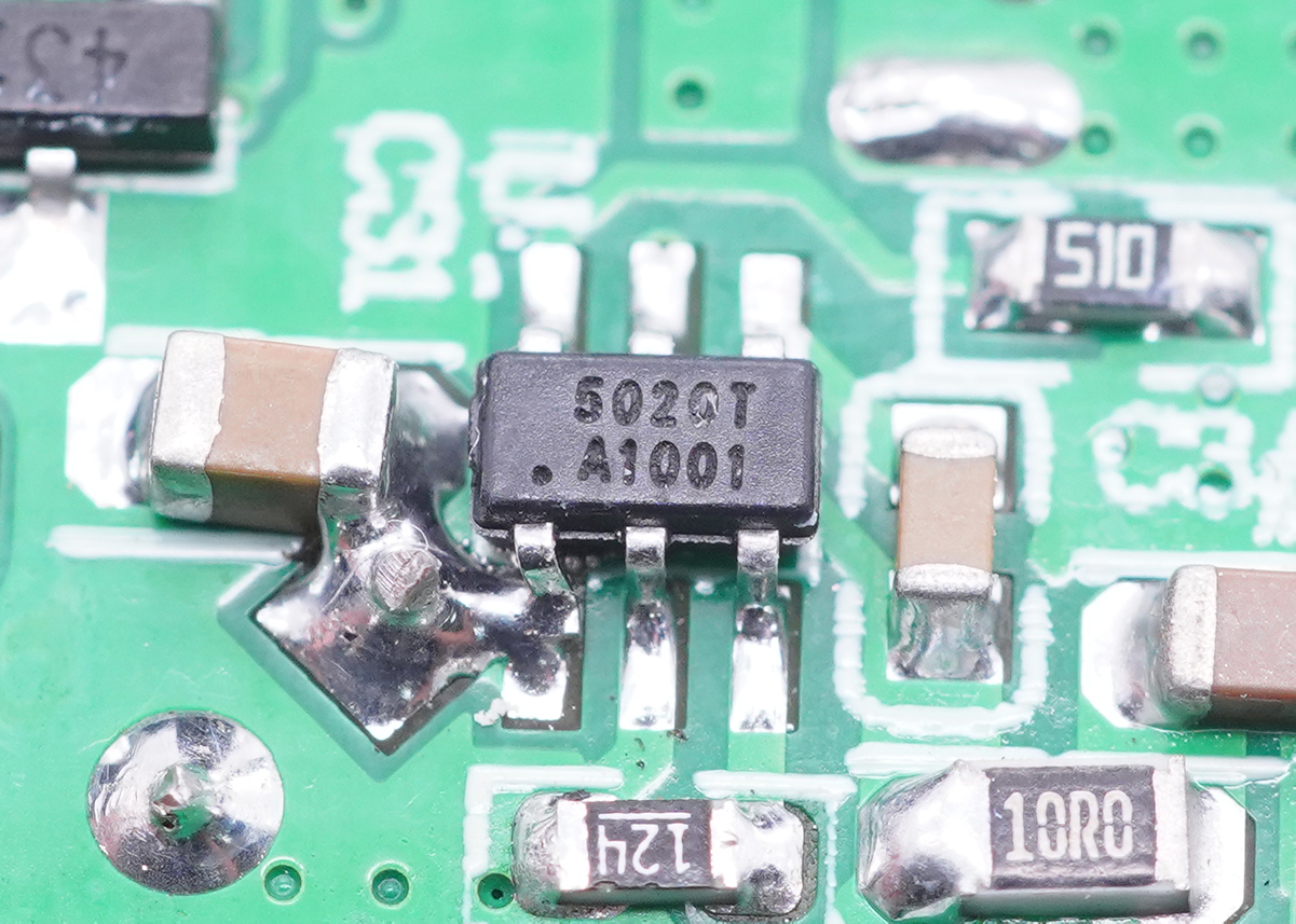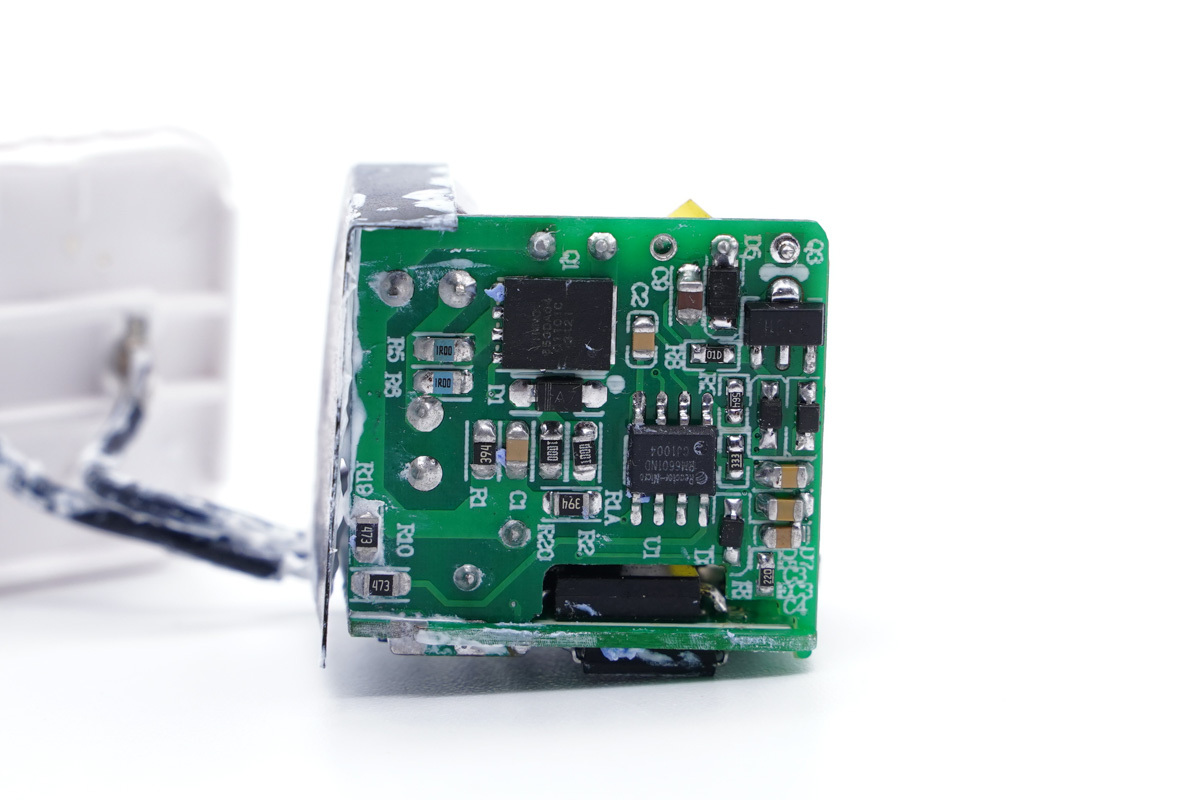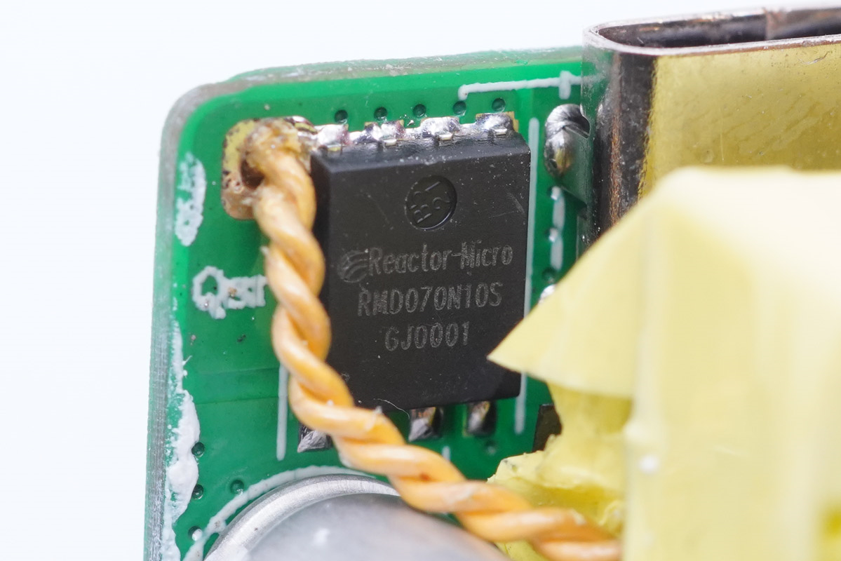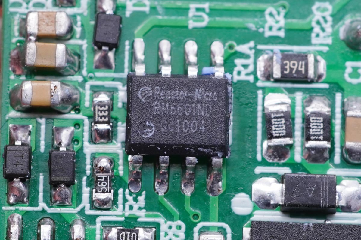 这款充电器的同步整流控制器同样来自亚成微自研的RM5020T,这是一款用于替代反激变换器中副边肖特基二极管的高性能同步整流控制芯片,外推超低导通阻抗MOSFET以提升系统效率。MOS导通时,Vds被控制在约-30mV, Vds一旦变为正值,MOSFET以极快速度关闭。 RM5020T采用高压自供电方式实现VCC供电,同时支持正端接法和负端接法。这使得芯片在输出电压很低甚至短路时,VCC仍可稳定供电,可直接应用于电池充电。可编程的振铃检测可防止芯片在DCM和QR模式下Vds振荡导致的错误开启。
