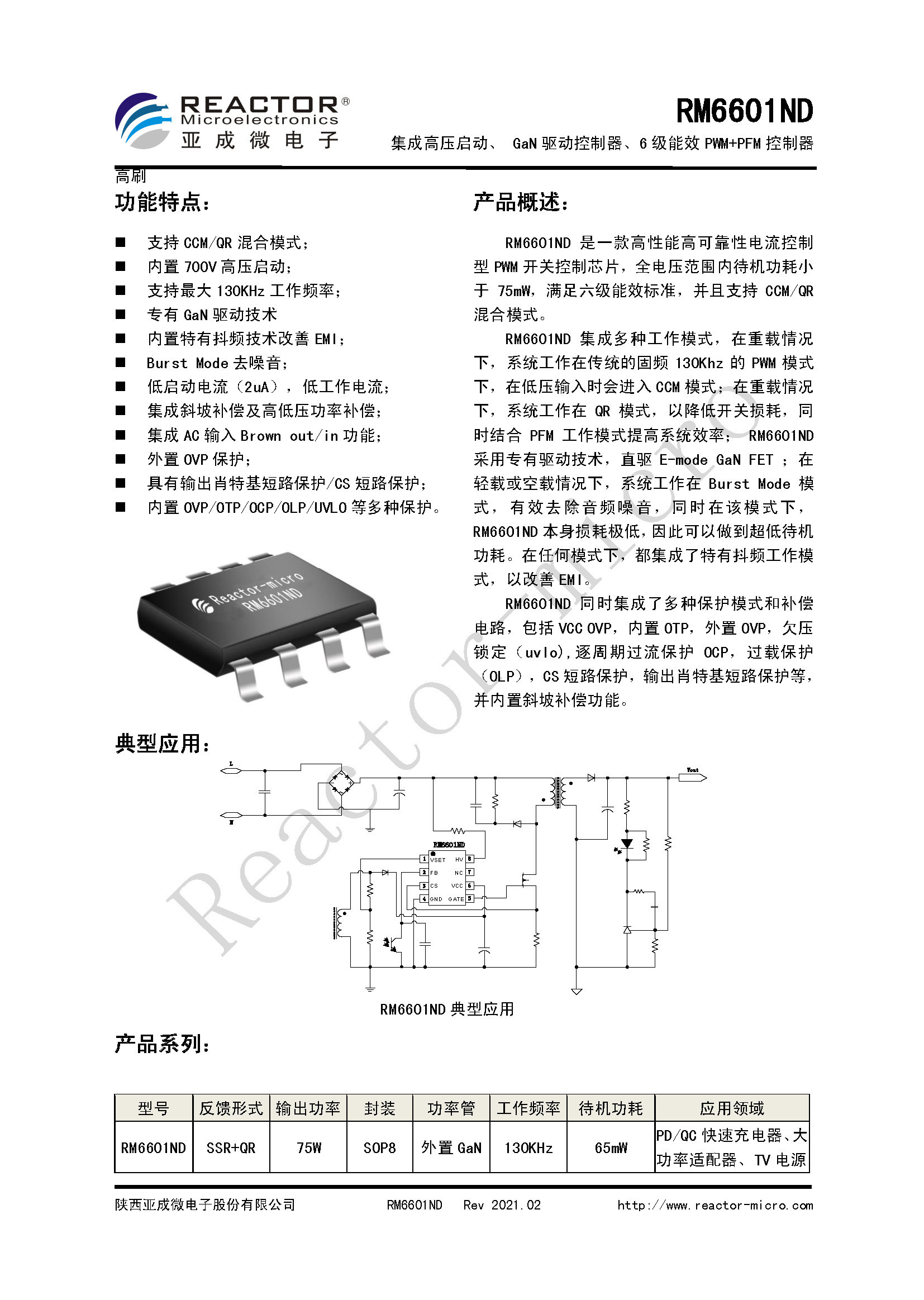 亚成微33W氮化镓快充方案主控采用亚成微自研的PWM开关控制芯片RM6601ND,这是一款集成了高压启动、GaN驱动器、满足六级能效要求的PWM+PFM控制器。支持CCM和QR工作模式,内置700V高压启动,开关频率最高为130KHz,支持抖频功能改善EMI,集成斜坡补偿和高低压功率补偿。