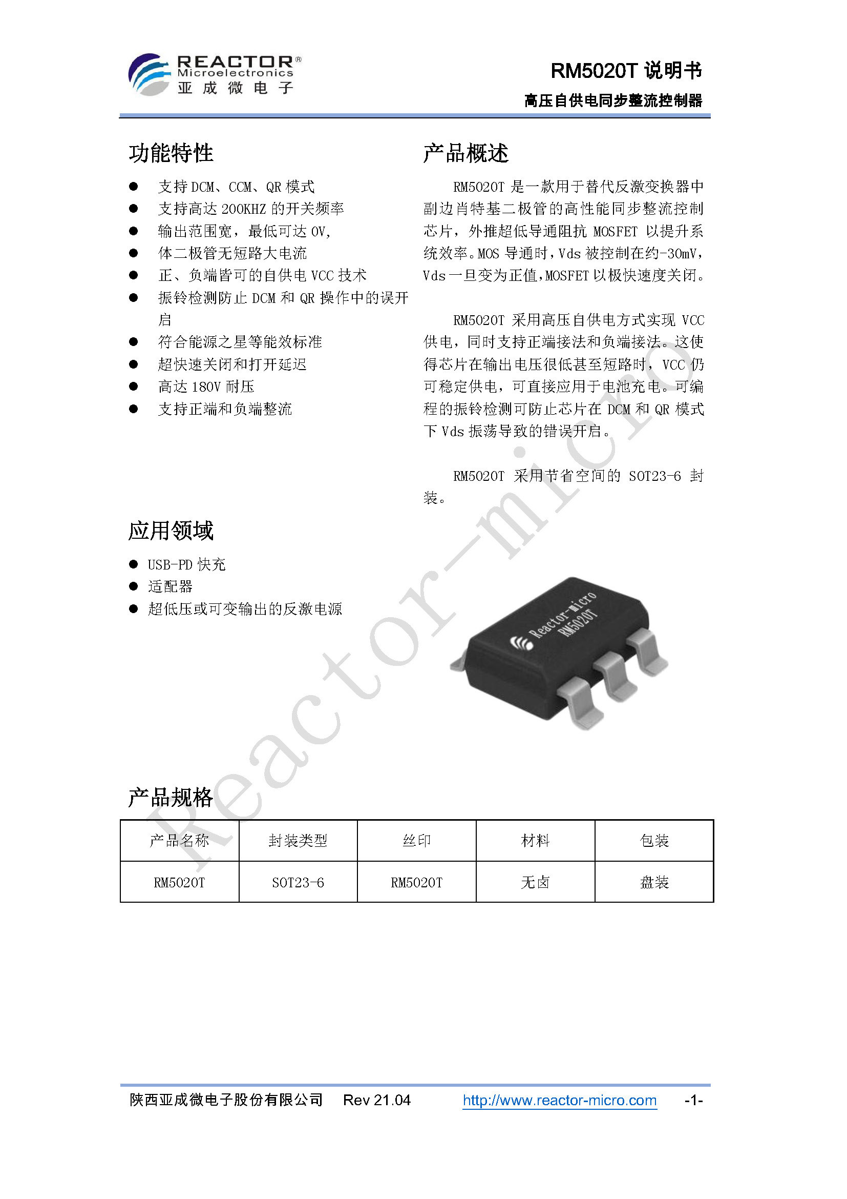 亚成微RM5020T支持DCM、CCM、QR工作模式,开关频率最高支持200KHz,支持宽范围输出电压。支持高侧和低侧同步整流,内置振铃检测防止误开启,具有低开关延迟。