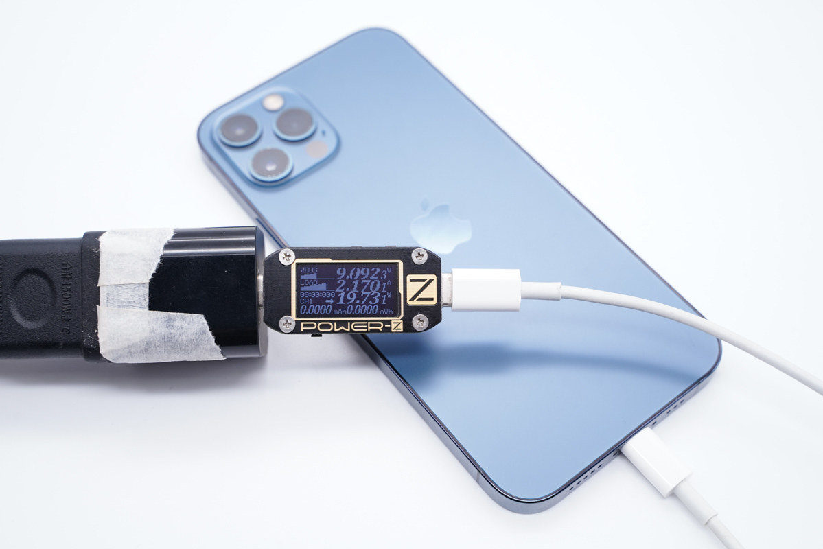 使用充电器为iPhone 12 Pro充电,握手9V电压,功率在20W左右。
