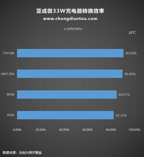 充电器本质上是一种转换设备,过程中会有损耗,以热量的形式散发出来。我们平时看充电器上面的参数输出100W或者65W是充电器可以为设备提供的最大输出功率,但充电器从插座上汲取的功率往往要更大一些,下面是亚成微33W氮化镓快充方案在220V 50Hz和110V 60Hz交流输入的情况下分别进行了转换效率测试,测试结果如下: