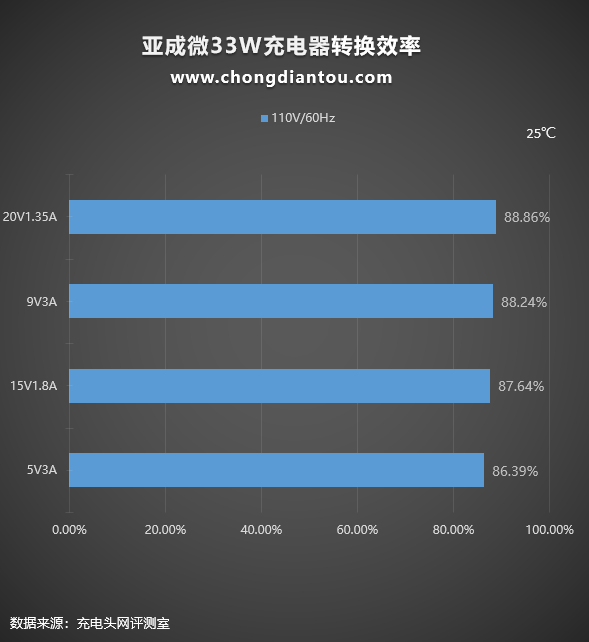 110V 60Hz下,充电器的转换效率从86.39%到88.86%不等。