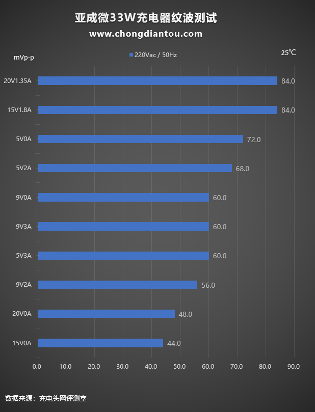 这是使用亚成微33W氮化镓快充方案在220V 50Hz交流输入下的纹波测试,纹波测试分为空载(柱状图中Y轴电流为0A)和重载(柱状图中Y轴电流为非0A)两种。纹波最高为84mVp-p,充电器处于20V1.35A输出状态;最低为44mVp-p,充电器处于15V0A空载状态。