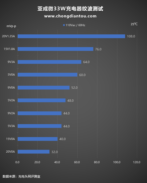 110V 60Hz下,纹波最高为108mVp-p,充电器处于20V1.35A输出状态;最低为32mVp-p,充电器处于20V0A空载状态。
