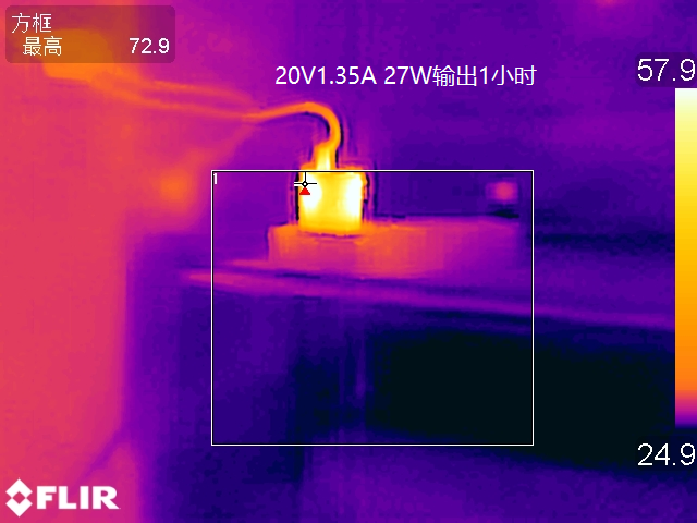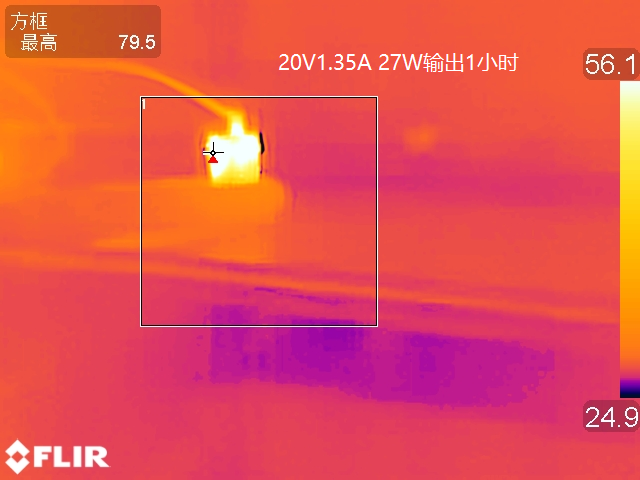 最后还对充电器的温控方面进行了测试,测试在25℃的恒温箱内进行,测试条件为以20V1.35A 27W的功率持续满载输出1小时后使用热成像仪对充电器表面的温度进行采集。