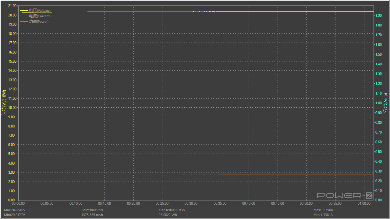 在测试温度时同时也对充电器是否可以满载运行做了测试,按照额定功率20V 1.35A 33W满载对充电器进行稳定性测试,测试时间为一小时,测试过程中电压值呈水平直线,无明显波动情况,长时间满载比较稳定。
