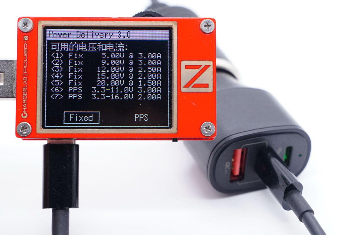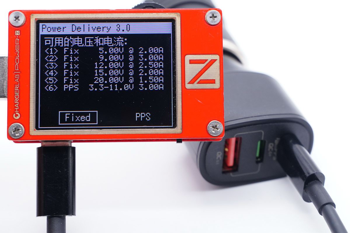 使用POWER-Z KT002 USB测试仪读取USB-C1 PDO报文,基于PD3.0快速充电标准开发,带有5V2A / 9V3A / 12V2.5A / 15V2A / 20V1.5A五个固定电压档,并支持3.3-11V3A一组PPS电压子集。