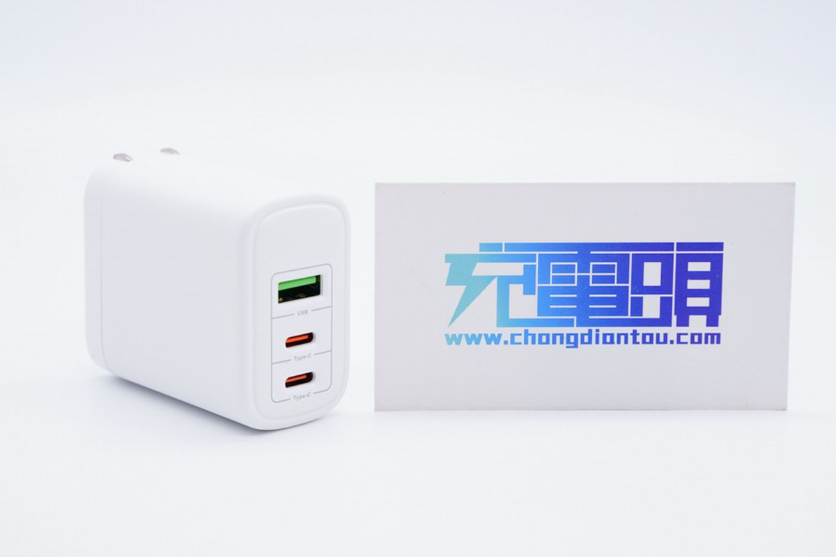 接口配置方面,2C1A三个万金油接口竖立排列放置,两个橘色USB-C接口支持功率盲插功能,单独使用均可输出65W。USB-A采用绿色大电流母座,支持多协议快充输出,最大输出功率45W。