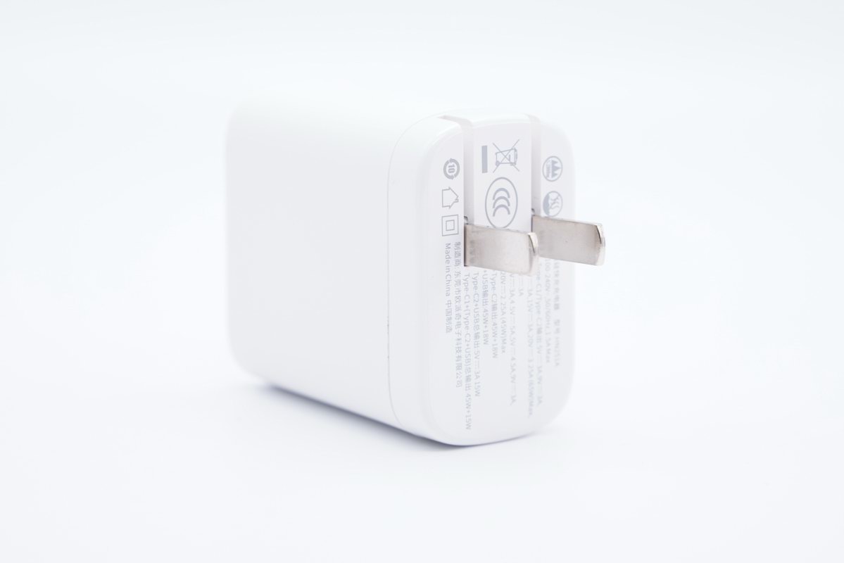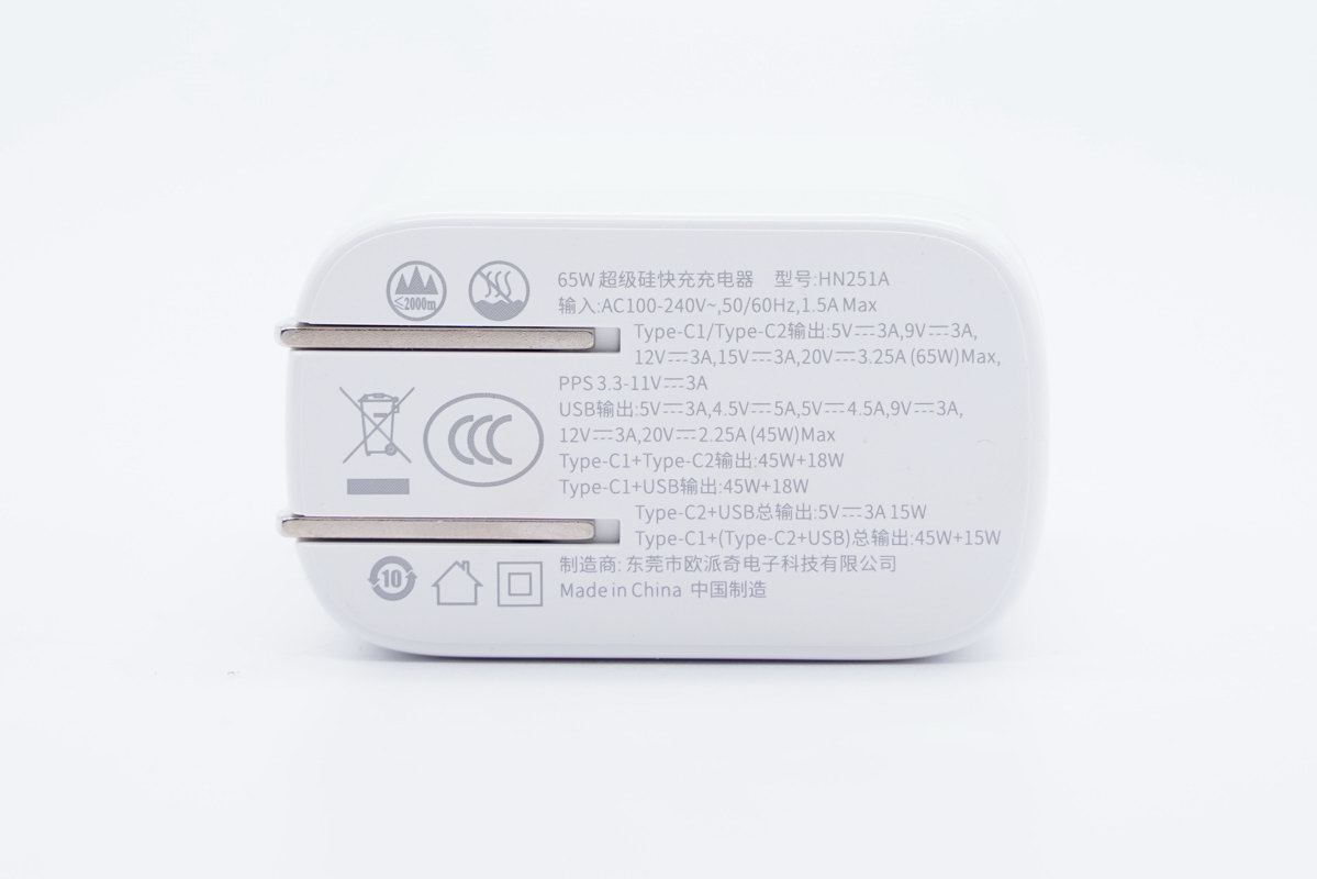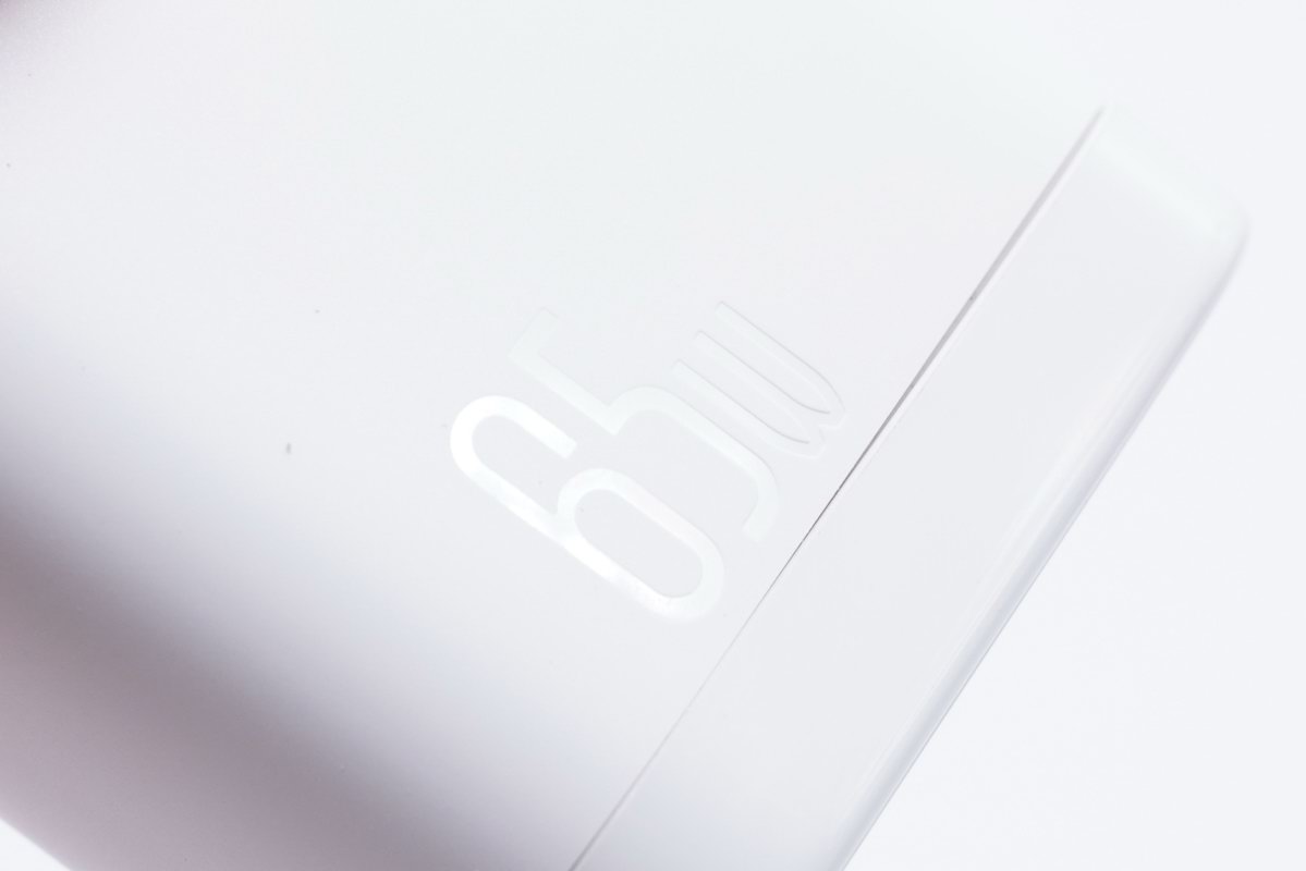 仔细看壳体可以发现,在整体消光的壳体侧面,使用亮面工艺凹印了65W功率标识,表示它最大支持65W快充输出。