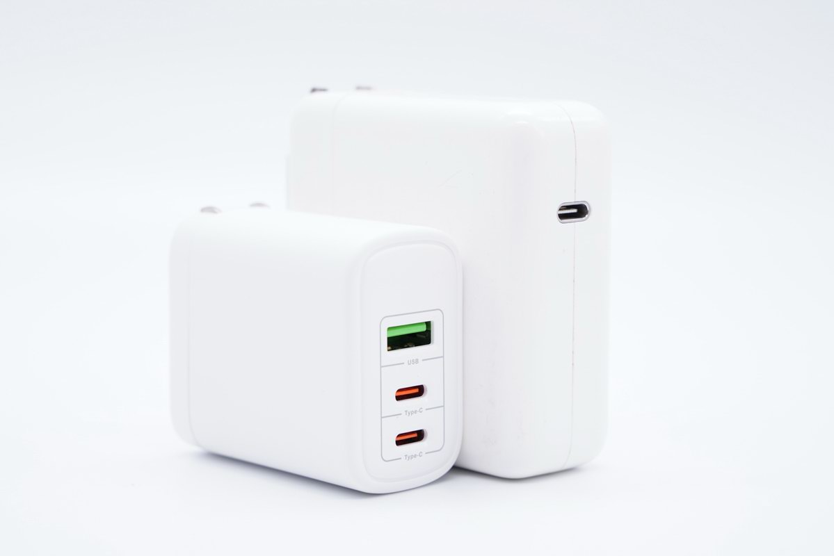实测三围尺寸分别是30.82mm X 58.91mm X 50.63mm,重量133.6g,按照65W额定输出功率计算,其功率密度为0.7W/cm³,与苹果61W充电器放在一起,体积优势十分明显,并且具有更多的接口,使用范围更广泛。